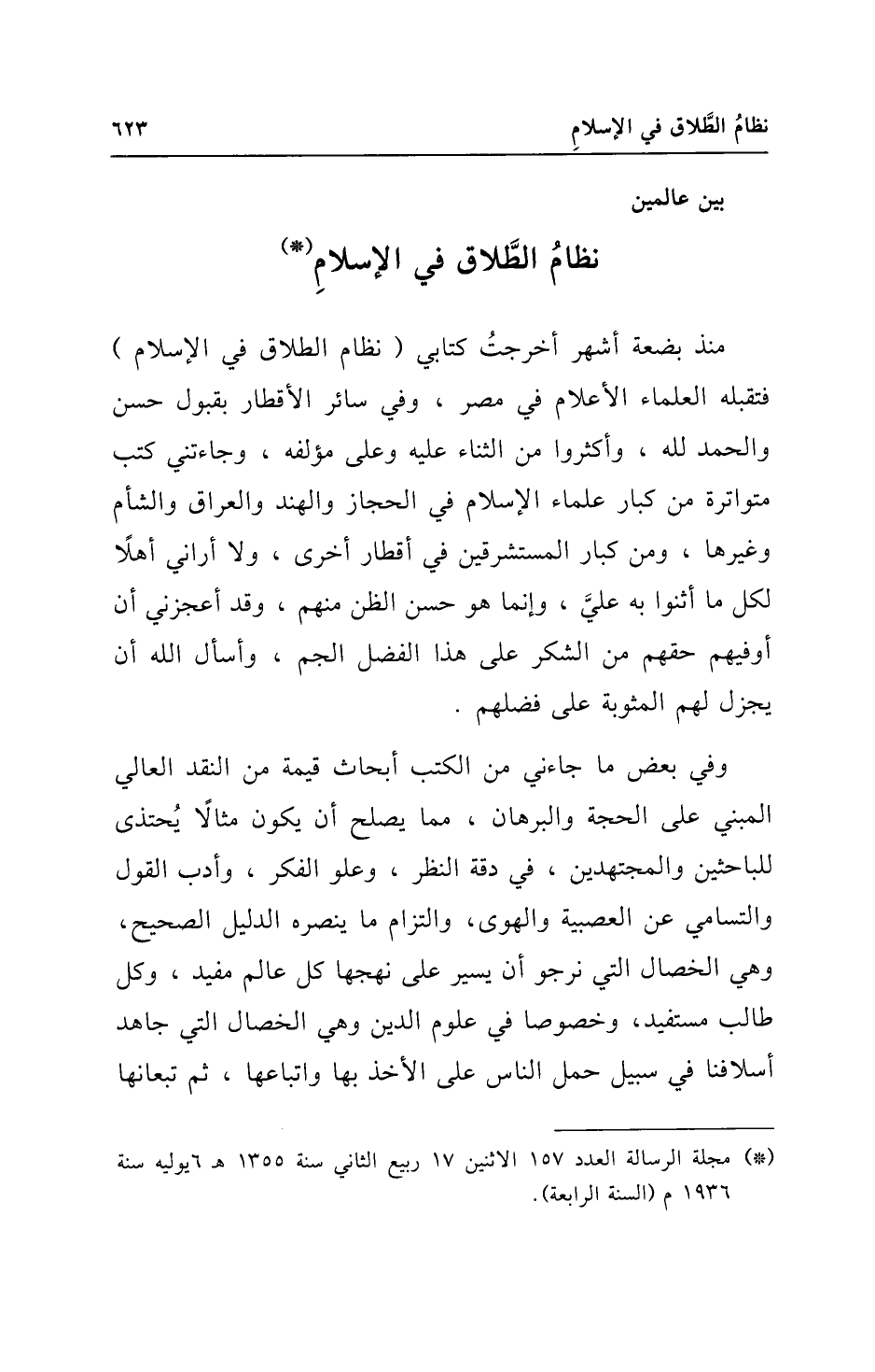 منذ بضعة أشهر أخرجتُ كتابي (نظام الطلاق في الإسلام) فتقبله العلماء الأعلام في مصر، وفي سائر الأقطار بقبول حسن والحمد لله، وأكثروا من الثناء عليه وعلى مؤلفه، وجاءتني كتب متواترة من كبار علماء الإسلام في الحجاز والهند والعراق والشأم وغيرها، ومن كبار المستشرقين في أقطار أخرى، ولا أراني أهلًا لكل ما أثنوا به عليَّ، وإنما هو حسن الظن منهم، وقد أعجزني أن أوفيهم حقهم من الشكر على هذا الفضل الجم، وأسأل الله أن يجزل لهم المثوبة على فضلهم.