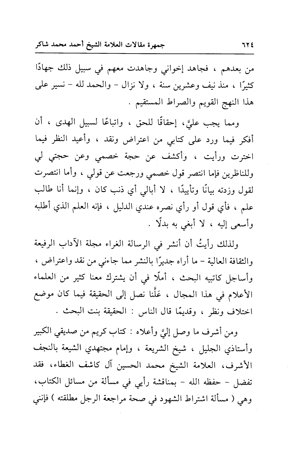 ومن أشرف ما وصل إليَّ وأعلاه: كتاب كريم من صديقي الكبير وأستاذي الجليل، شيخ الشريعة، وإمام مجتهدي الشيعة بالنجف الأشرف، العلامة الشيخ محمد الحسين آل كاشف الغطاء، فقد تفضل - حفظه الله - بمناقشة رأي في مسألة من مسائل الكتاب، وهي (مسألة اشتراط الشهود في صحة مراجعة الرجل مطلقته) فإنني