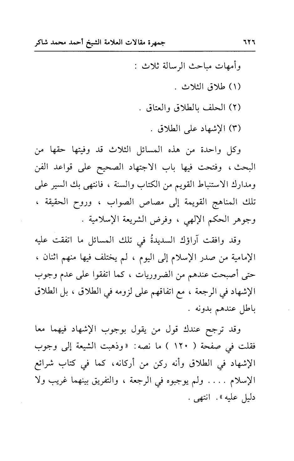 وقد وافقت آراؤك السديدةُ في تلك المسائل ما اتفقت عليه الإمامية من صدر الإسلام إلى اليوم، لم يختلف فيها منهم اثنان، حتى أصبحت عندهم من الضروريات، كما اتفقوا على عدم وجوب الإشهاد في الرجعة، مع اتفاقهم على لزومه في الطلاق، بل الطلاق باطل عندهم بدونه.