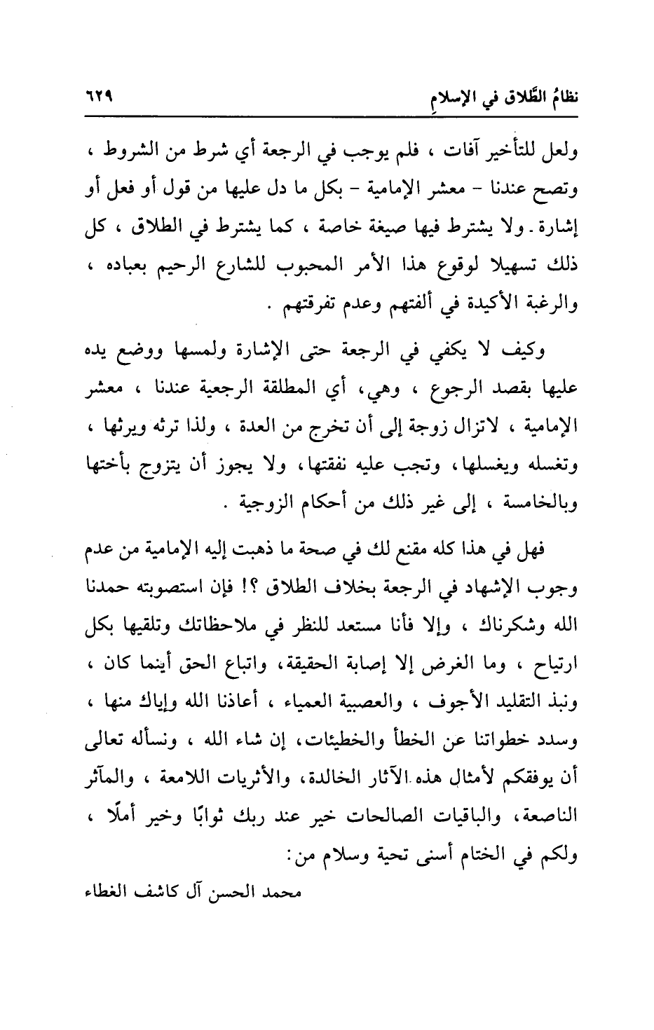 فهل في هذا كله مقنع لك في صحة ما ذهبت إليه الإمامية من عدم وجوب الإشهاد في الرجعة بخلاف الطلاق؟ ! فإن استصوبته حمدنا الله وشكرناك، وإلا فأنا مستعد للنظر في ملاحظاتك وتلقيها بكل ارتياح، وما الغرض إلا إصابة الحقيقة، واتباع الحق أينما كان، ونبذ التقليد الأجوف، والعصبية العمياء، أعاذنا الله وإياك منها، وسدد خطواتنا عن الخطأ والخطيئات، إن شاء الله، ونسأله تعالى أن يوفقكم لأمثال هذه الآثار الخالدة، والأثريات اللامعة، والمآثر الناصعة، والباقيات الصالحات خير عند ربك ثوابًا وخير أملًا، ولكم في الختام أسنى تحية وسلام من: