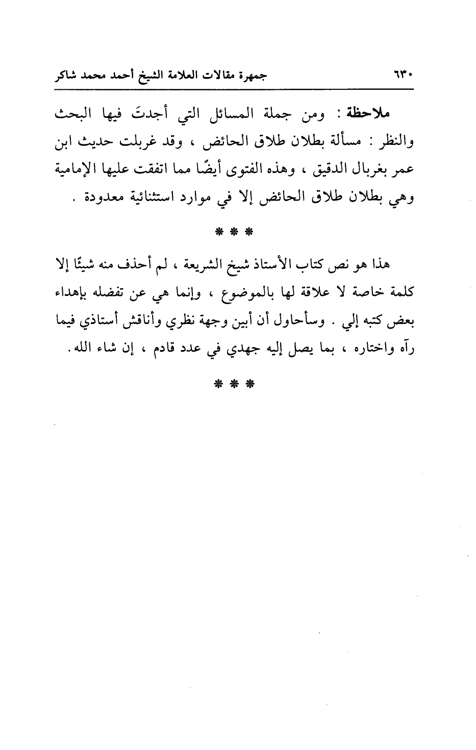 هذا هو نص كتاب الأستاذ شيخ الشريعة، لم أحذف منه شيئًا إلا كلمة خاصة لا علاقة لها بالموضوع، وإنما هي عن تفضله بإهداء بعض كتبه إلي. وسأحاول أن أبين وجهة نظري وأناقش أستاذي فيما رآه واختاره، بما يصل إليه جهدي في عدد قادم، إن شاء الله.