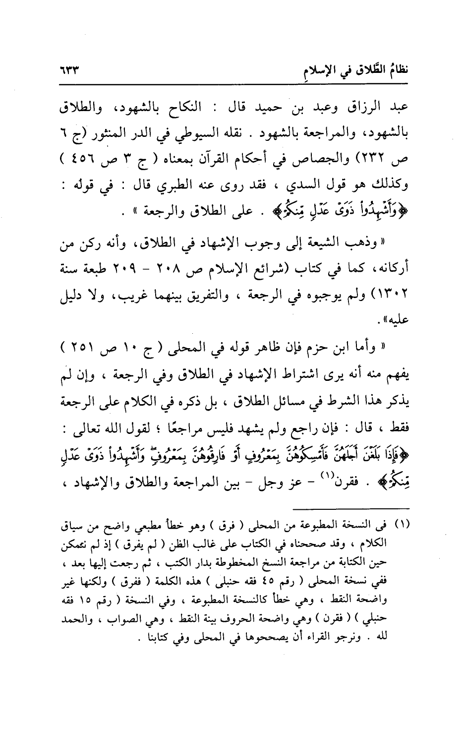 "وذهب الشيعة إلى وجوب الإشهاد في الطلاق، وأنه ركن من أركانه، كما في كتاب (شرائع الإسلام ص 208 - 209 طبعة سنة 1302) ولم يوجبوه في الرجعة، والتفريق بينهما غريب، ولا دليل عليه".