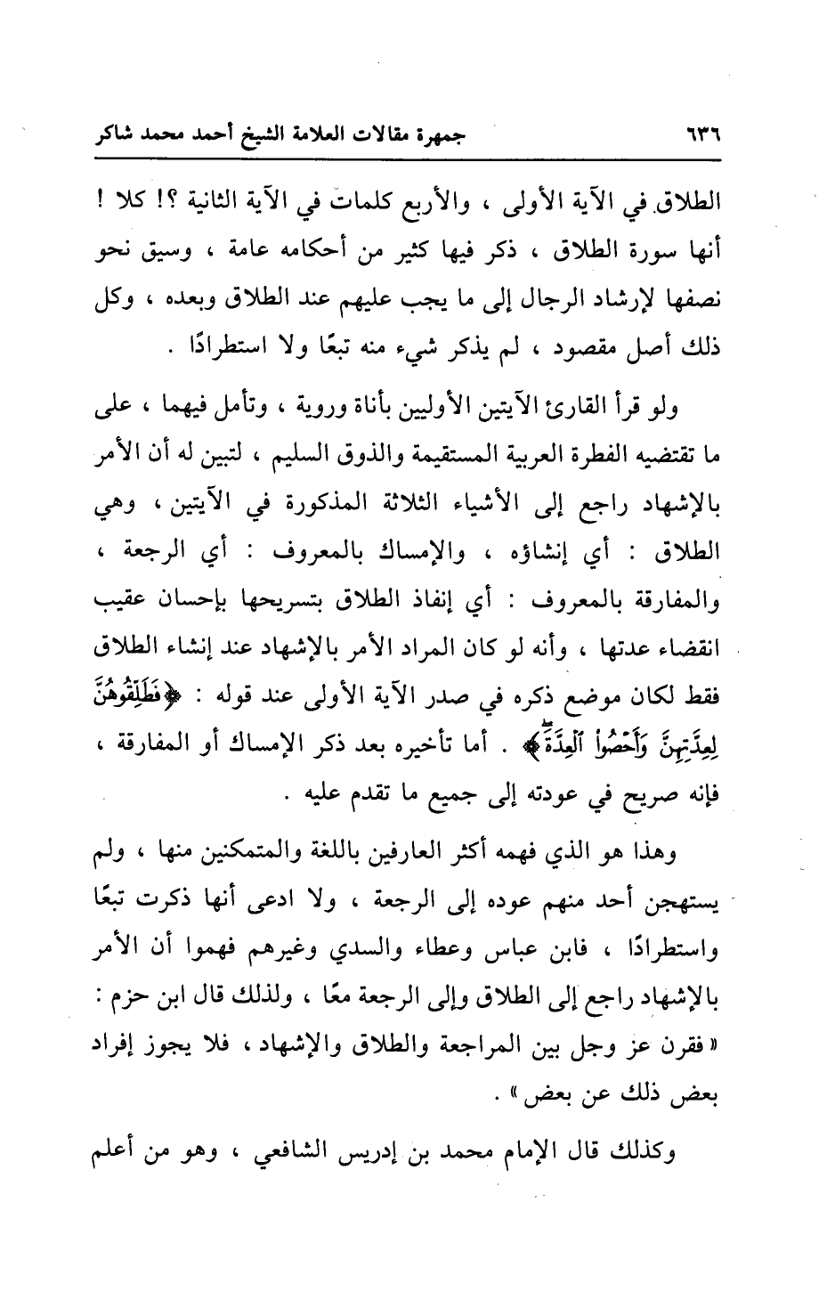ولو قرأ القارئ الآيتين الأوليين بأناة وروية، وتأمل فيهما، على ما تقتضيه الفطرة العربية المستقيمة والذوق السليم، لتبين له أن الأمر بالإشهاد راجع إلى الأشياء الثلاثة المذكورة في الآيتين، وهي الطلاق: أي إنشاؤه، والإمساك بالمعروف: أي الرجعة، والمفارقة بالمعروف: أي إنفاذ الطلاق بتسريحها بإحسان عقيب انقضاء عدتها، وأنه لو كان المراد الأمر بالإشهاد عند إنشاء الطلاق فقط لكان موضع ذكره في صدر الآية الأولى عند قوله: {فَطَلِّقُوهُنَّ لِعِدَّتِهِنَّ وَأَحْصُوا الْعِدَّةَ}. أما تأخيره بعد ذكر الإمساك أو المفارقة، فإنه صريح في عودته إلى جميع ما تقدم عليه.