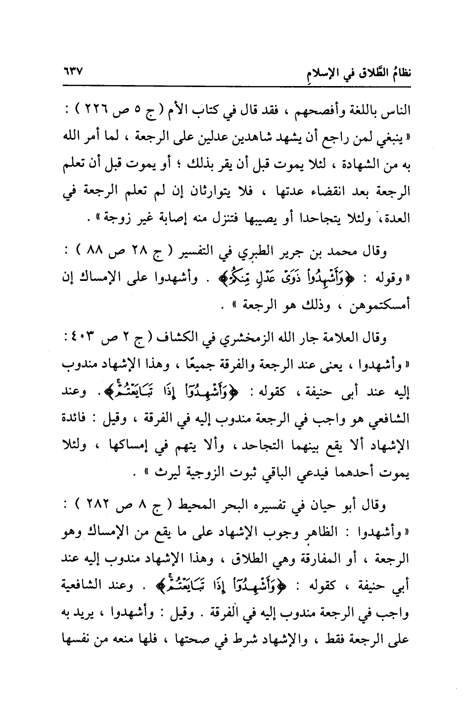 وقال أبو حيان في تفسيره البحر المحيط (ج 8 ص 282): "وأشهدوا: الظاهر وجوب الإشهاد على ما يقع من الإمساك. وهو الرجعة، أو المفارقة وهي الطلاق، وهذا الإشهاد مندوب إليه عند أبي حنيفة، كقوله: {وَأَشْهِدُوا إِذَا تَبَايَعْتُمْ}. وعند الشافعية واجب في الرجعة مندوب إليه في الفرقة. وقيل: وأشهدوا، يريد به على الرجعة فقط، والإشهاد شرط في صحتها، فلها منعه من نفسها