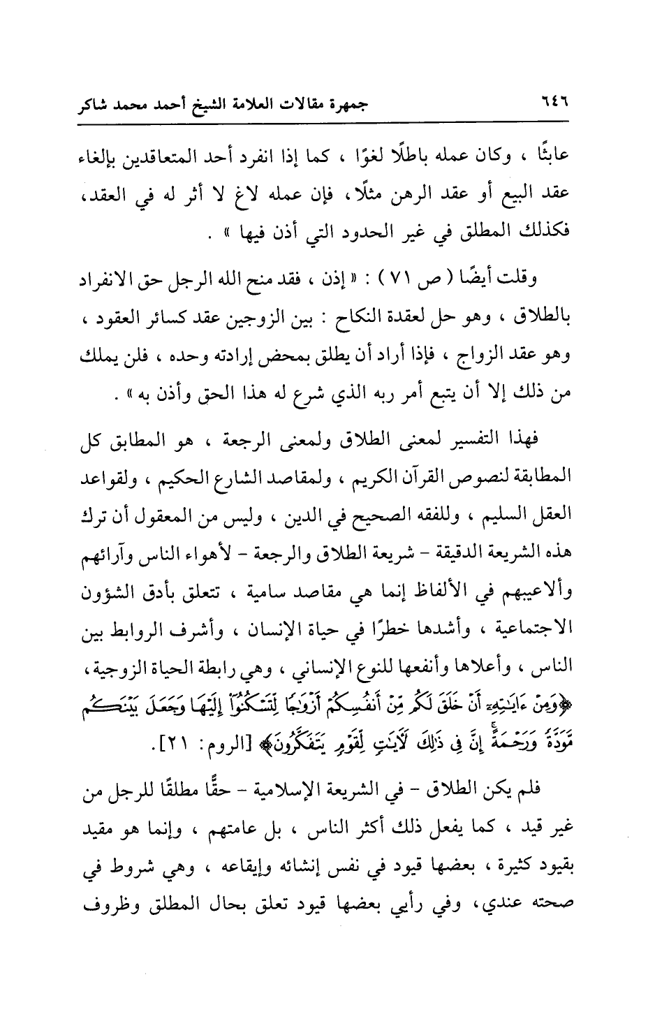 وقلت أيضًا (ص 71): "إذن، فقد منح الله الرجل حق الانفراد بالطلاق، وهو حل لعقدة النكاح: بين الزوجين عقد كسائر العقود، وهو عقد الزواج، فإذا أراد أن يطلق بمحض إرادته وحده، فلن يملك من ذلك إلا أن يتبع أمر ربه الذي شرع له هذا الحق وأذن به".