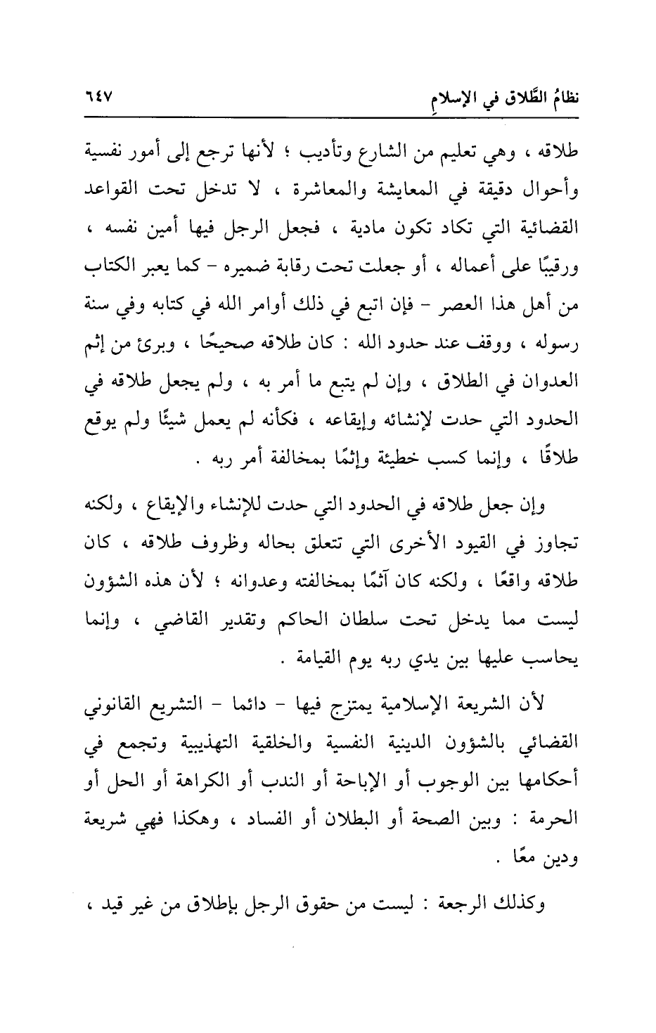 طلاقه، وهي تعليم من الشارع وتأديب؛ لأنها ترجع إلى أمور نفسية وأحوال دقيقة في المعايشة والمعاشرة، لا تدخل تحت القواعد القضائية التي تكاد تكون مادية، فجعل الرجل فيها أمين نفسه، ورقيبًا على أعماله، أو جعلت تحت رقابة ضميره - كما يعبر الكتاب من أهل هذا العصر - فإن اتبع في ذلك أوامر الله في كتابه وفي سنة رسوله، ووقف عند حدود الله: كان طلاقه صحيحًا، وبرئ من إثم العدوان في الطلاق، وإن لم يتبع ما أمر به، ولم يجعل طلاقه في الحدود التي حدت لإنشائه وإيقاعه، فكأنه لم يعمل شيئًا ولم يوقع طلاقًا، وإنما كسب خطيئة وإثمًا بمخالفة أمر ربه.