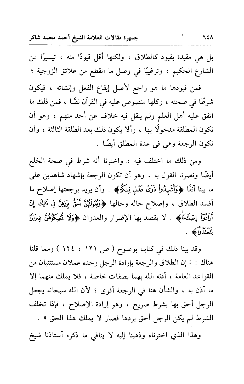 وقد بينا ذلك في كتابنا بوضوح (ص 121، 124) ومما قلنا هناك: "إن الطلاق والرجعة بإرادة الرجل وحده عملان مستثنيان من القواعد العامة، أذنه الله بهما بصفات خاصة، فلا يملك منهما إلا ما أذن به، والشأن هنا في الرجعة أقوى؛ لأن الله سبحانه يجعل الرجل أحق بها بشرط صريح، وهو إرادة الإصلاح، فإذا تخلف الشرط لم يكن الرجل أحق بردها فصار لا يملك هذا الحق".