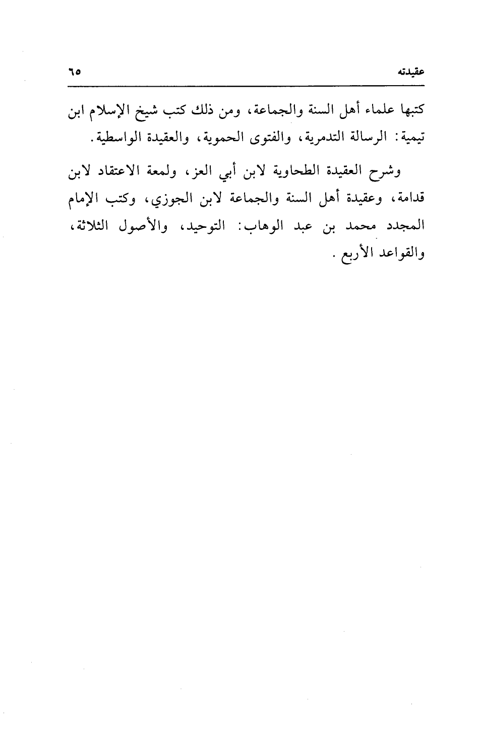 وشرح العقيدة الطحاوية لابن أبي العز، ولمعة الاعتقاد لابن قدامة، وعقيدة أهل السنة والجماعة لابن الجوزي، وكتب الإمام المجدد محمد بن عبد الوهاب: التوحيد، والأصول الثلاثة، والقواعد الأربع.