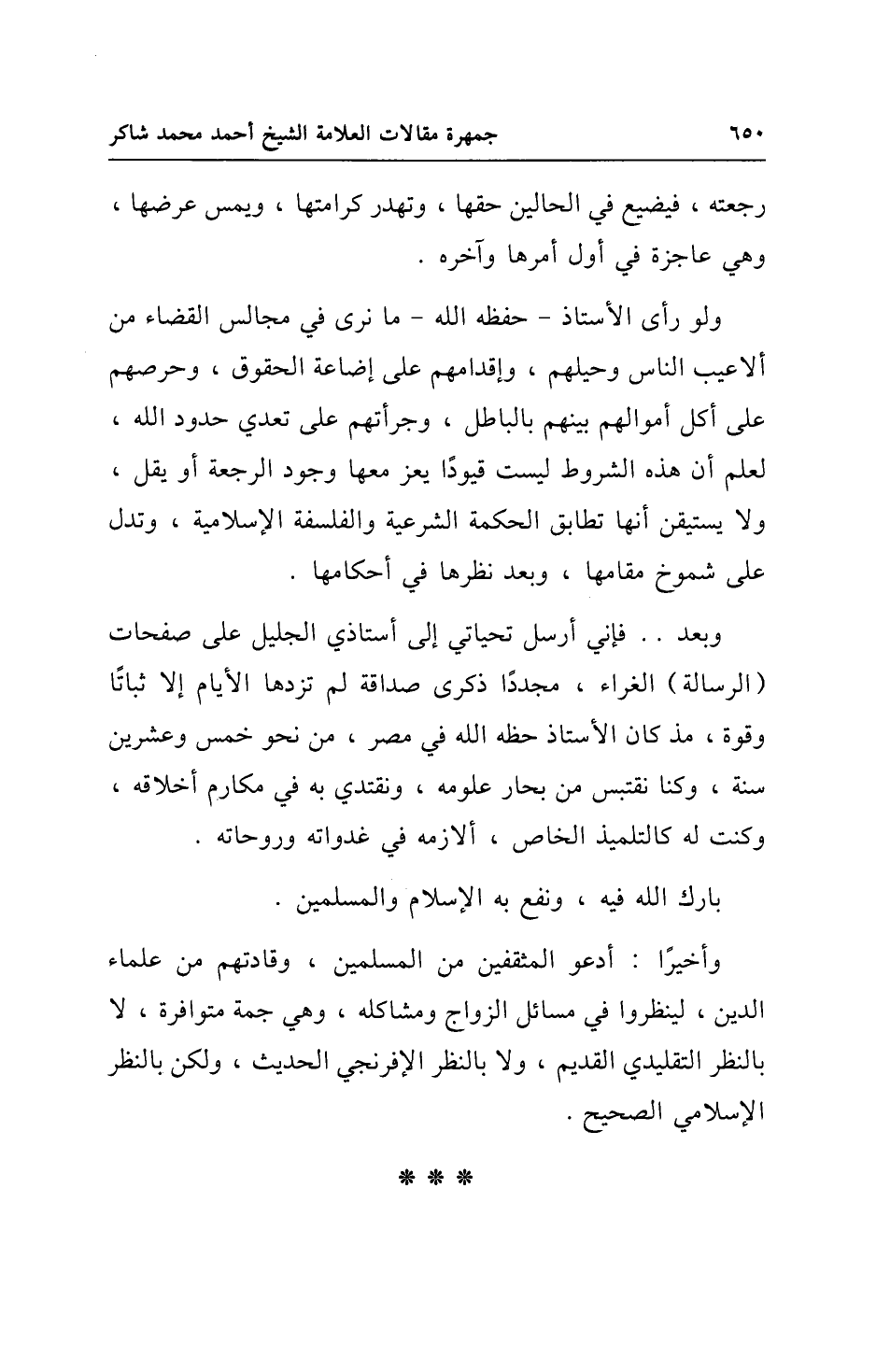 وأخيرًا: أدعو المثقفين من المسلمين، وقادتهم من علماء الدين، لينظروا في مسائل الزواج ومشاكله، وهي جمة متوافرة، لا بالنظر التقليدي القديم، ولا بالنظر الإفرنجي الحديث، ولكن بالنظر الإسلامي الصحيح.