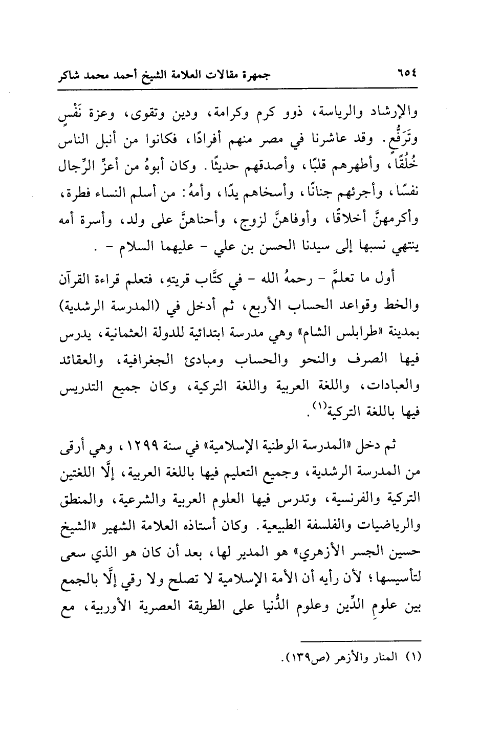 والإرشاد والرياسة، ذوو كرم وكرامة، ودين وتقوى، وعزة نَفْسٍ وتَرَفُّعٍ. وقد عاشرنا في مصر منهم أفرادًا، فكانوا من أنبل الناس خُلُقًا، وأطهرهم قلبًا، وأصدقهم حديثًا. وكان أبوهُ من أعزِّ الرِّجال نفسًا، وأجرئهم جنانًا، وأسخاهم يدًا، وأمهُ: من أسلم النساء فطرة، وأكرمهنَّ أخلاقًا، وأوفاهنَّ لزوج، وأحناهنَّ على ولد، وأسرة أمه ينتهي نسبها إلى سيدنا الحسن بن علي - عليهما السلام -.