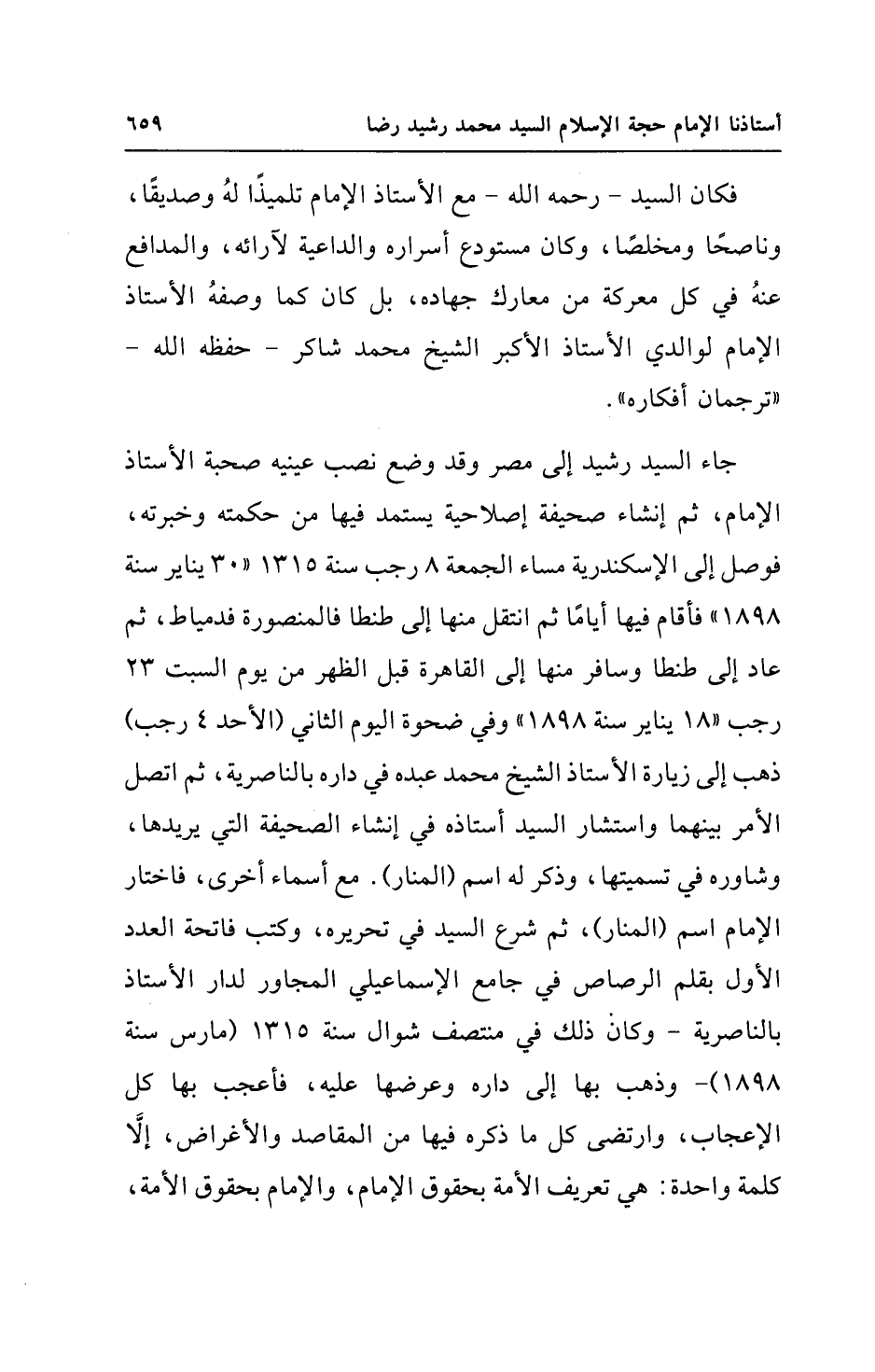 فكان السيد - رحمه الله - مع الأستاذ الإمام تلميذًا لهُ وصديقًا، وناصحًا ومخلصًا، وكان مستودع أسراره والداعية لآرائه، والمدافع عنهُ في كل معركة من معارك جهاده، بل كان كما وصفهُ الأستاذ الإمام لوالدي الأستاذ الأكبر الشيخ محمد شاكر - حفظه الله - "ترجمان أفكاره".