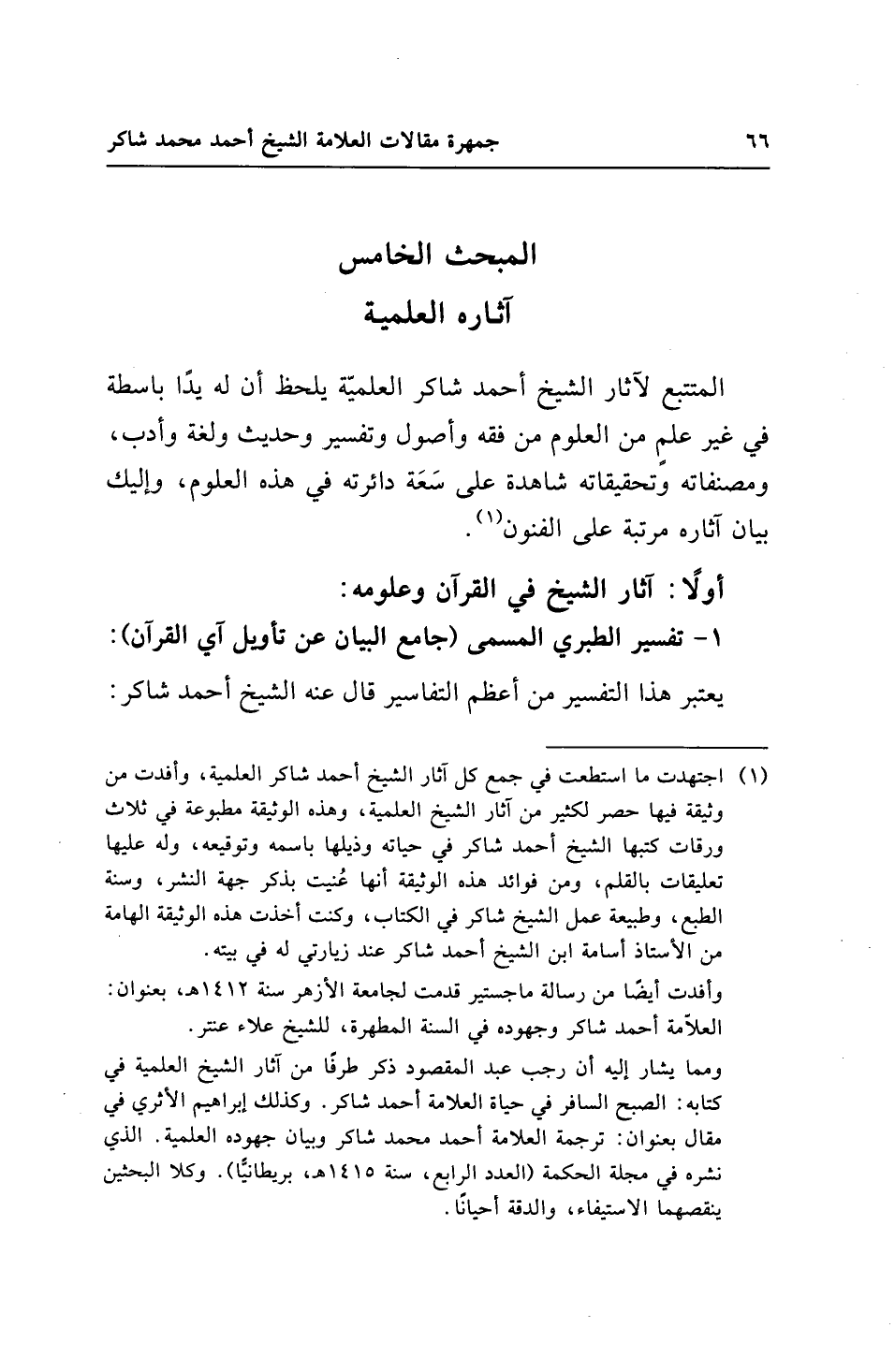 (¬1) اجتهدت ما استطعت في جمع كل آثار الشيخ أحمد شاكر العلمية، وأفدت من وثيقة فيها حصر لكثير من آثار الشيخ العلمية، وهذه الوثيقة مطبوعة في ثلاث ورقات كتبها الشيخ أحمد شاكر في حياته وذيلها باسمه وتوقيعه، وله عليها تعليقات بالقلم، ومن فوائد هذه الوثيقة أنها عُنيت بذكر جهة النشر، وسنة الطبع، وطبيعة عمل الشيخ شاكر في الكتاب، وكنت أخذت هذه الوثيقة الهامة من الأستاذ أسامة ابن الشيخ أحمد شاكر عند زيارتي له في بيته.
