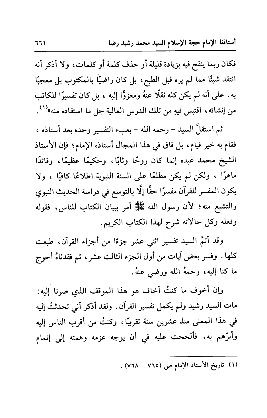 وإن أخوف ما كنتُ أخاف هو هذا الموقف الذي صرنا إليه: مات السيد رشيد ولم يكمل تفسير القرآن. ولقد أذكر أني تحدثتُ إليه في هذا المعنى منذ عشرين سنة تقريبًا، وكنتُ من أقرب الناس إليه وأبرّهم به، فألححت عليه في أن يوجه عزمه وهمته إلى إتمام