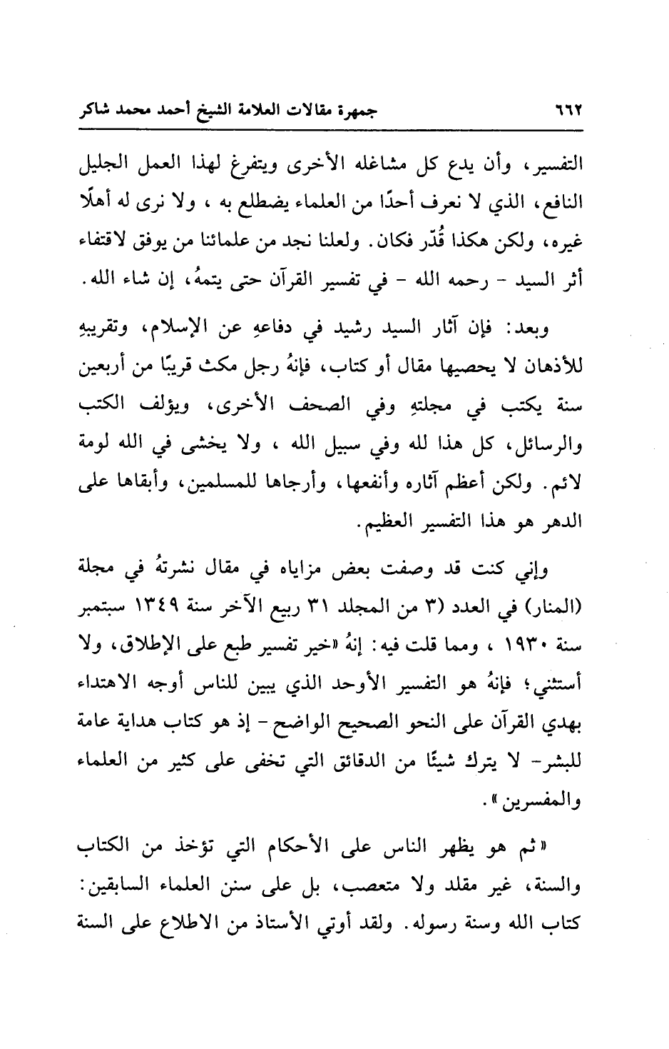 وبعد: فإن آثار السيد رشيد في دفاعهِ عن الإسلام، وتقريبهِ للأذهان لا يحصيها مقال أو كتاب، فإنهُ رجل مكث قريبًا من أربعين سنة يكتب في مجلتهِ وفي الصحف الأخرى، ويؤلف الكتب والرسائل، كل هذا لله وفي سبيل الله، ولا يخشى في الله لومة لائم. ولكن أعظم آثاره وأنفعها، وأرجاها للمسلمين، وأبقاها على الدهر هو هذا التفسير العظيم.
