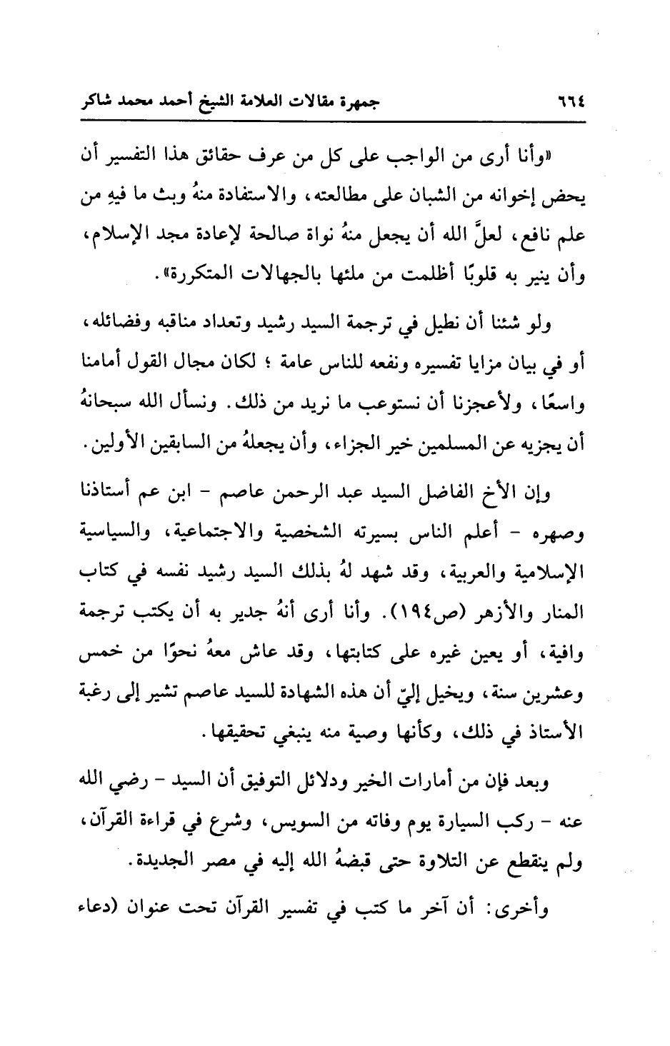 وإن الأخ الفاضل السيد عبد الرحمن عاصم - ابن عم أستاذنا وصهره - أعلم الناس بسيرته الشخصية والاجتماعية، والسياسية الإسلامية والعربية، وقد شهد لهُ بذلك السيد رشيد نفسه في كتاب المنار والأزهر (ص 194). وأنا أرى أنهُ جدير به أن يكتب ترجمة وافية، أو يعين غيره على كتابتها، وقد عاش معهُ نحوًا من خمس وعشرين سنة، ويخيل إليّ أن هذه الشهادة للسيد عاصم تشير إلى رغبة الأستاذ في ذلك، وكأنها وصية منه ينبغي تحقيقها.