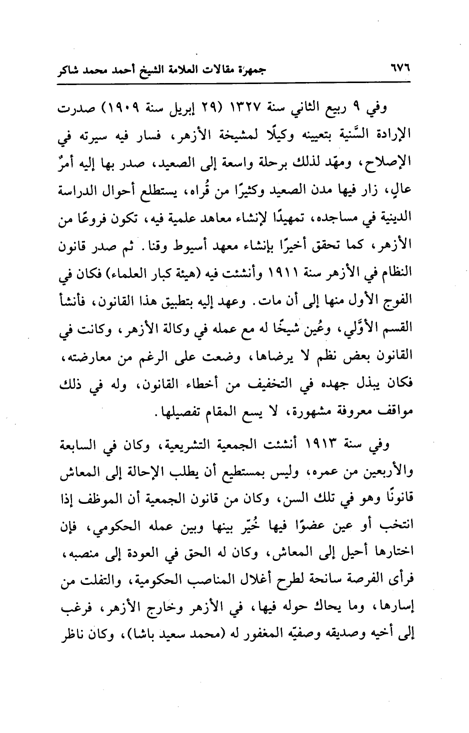 وفي سنة 1913 أنشئت الجمعية التشريعية، وكان في السابعة والأربعين من عمره، وليس بمستطيع أن يطلب الإحالة إلى المعاش قانونًا وهو في تلك السن، وكان من قانون الجمعية أن الموظف إذا انتخب أو عين عضوًا فيها خُيّر بينها وبين عمله الحكومي، فإن اختارها أحيل إلى المعاش، وكان له الحق في العودة إلى منصبه، فرأى الفرصة سانحة لطرح أغلال المناصب الحكومية، والتفلت من إسارها، وما يحاك حوله فيها، في الأزهر وخارج الأزهر، فرغب إلى أخيه وصديقه وصفيّه المغفور له (محمد سعيد باشا)، وكان ناظر
