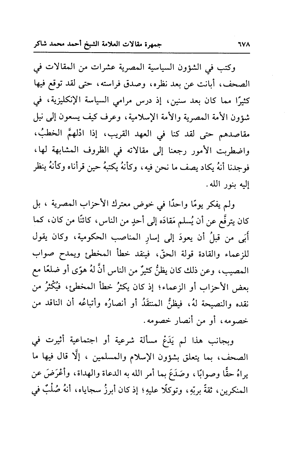 ولم يفكر يومًا واحدًا في خوض معترك الأحزاب المصرية، بل كان يترفَّع عن أن يُسلم مَقادَه إلى أحدٍ من الناس، كائنًا من كان، كما أَبَى من قبلُ أن يعودَ إلى إسارِ المناصب الحكومية، وكان يقول للزعماء والقادة قولة الحقّ، فينقد خطأ المخطئ ويمدح صواب المصيب، وعن ذلك كان يظنُّ كثيرٌ من الناس أنَّ لهُ هوًى أو ضلعًا مع بعض الأحزاب أو الزعماء؛ إذ كان يكثرُ خطأ المخطئ، فيُكْثرُ من نقده والنصيحة لهُ، فيظنُّ المنتقَدُ أو أنصارُه وأتباعُه أن الناقد من خصومه، أو من أنصار خصومه.