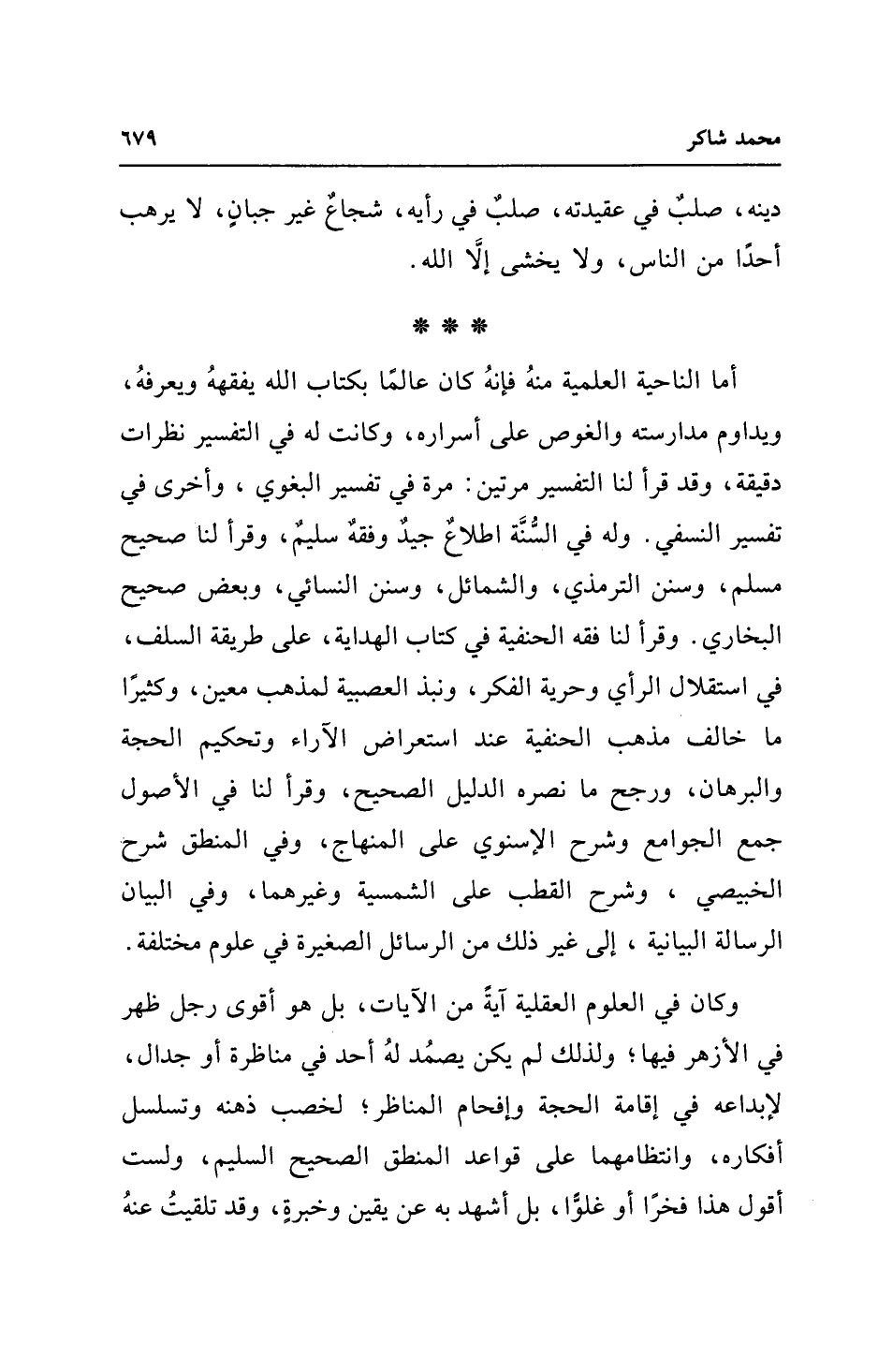 وكان في العلوم العقلية آيةً من الآيات، بل هو أقوى رجل ظهر في الأزهر فيها؛ ولذلك لم يكن يصمُد لهُ أحد في مناظرة أو جدال، لإبداعه في إقامة الحجة وإفحام المناظر؛ لخصب ذهنه وتسلسل أفكاره، وانتظامهما على قواعد المنطق الصحيح السليم، ولست أقول هذا فخرًا أو غلوًّا، بل أشهد به عن يقين وخبرةٍ، وقد تلقيتُ عنهُ