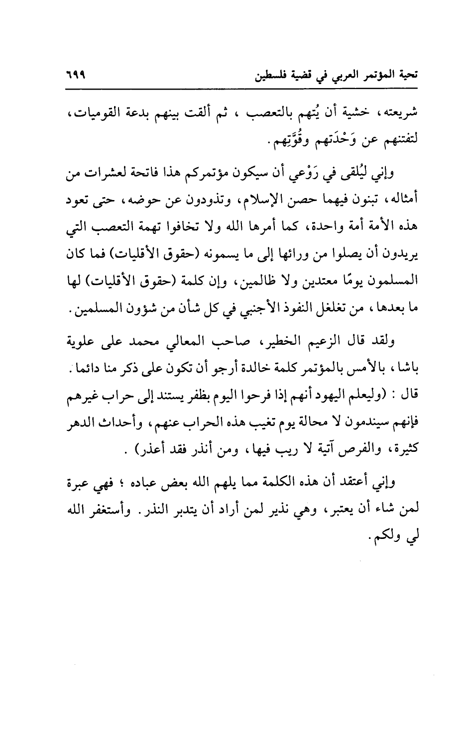 ولقد قال الزعيم الخطير، صاحب المعالي محمد على علوية باشا، بالأمس بالمؤتمر كلمة خالدة أرجو أن تكون على ذكر منا دائما. قال: (وليعلم اليهود أنهم إذا فرحوا اليوم بظفر يستند إلى حراب غيرهم فإنهم سيندمون لا محالة يوم تغيب هذه الحراب عنهم، وأحداث الدهر كثيرة، والفرص آتية لا ريب فيها، ومن أنذر فقد أعذر).