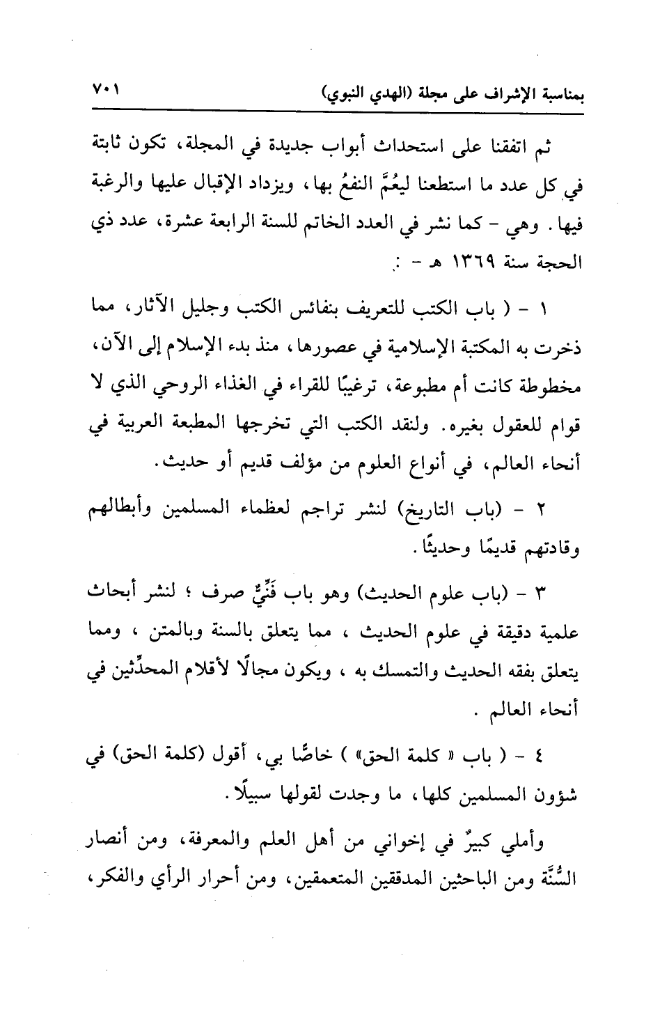 1 - (باب الكتب للتعريف بنفائس الكتب وجليل الآثار، مما ذخرت به المكتبة الإسلامية في عصورها، منذ بدء الإسلام إلى الآن، مخطوطة كانت أم مطبوعة، ترغيبًا للقراء في الغذاء الروحي الذي لا قوام للعقول بغيره. ولنقد الكتب التي تخرجها المطبعة العربية في أنحاء العالم، في أنواع العلوم من مؤلف قديم أو حديث.