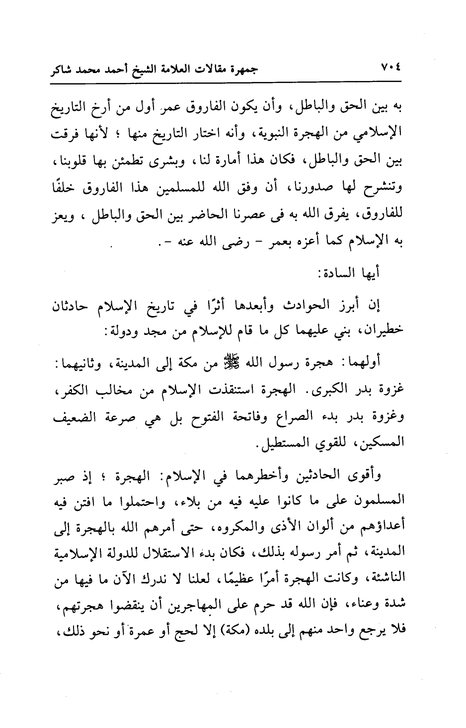 به بين الحق والباطل، وأن يكون الفاروق عمر أول من أرخ التاريخ الإسلامي من الهجرة النبوية، وأنه اختار التاريخ منها؛ لأنها فرقت بين الحق والباطل، فكان هذا أمارة لنا، وبشرى تطمئن بها قلوبنا، وتنشرح لها صدورنا، أن وفق الله للمسلمين هذا الفاروق خلفًا للفاروق، يفرق الله به فى عصرنا الحاضر بين الحق والباطل، ويعز به الإسلام كما أعزه بعمر - رضي الله عنه -.