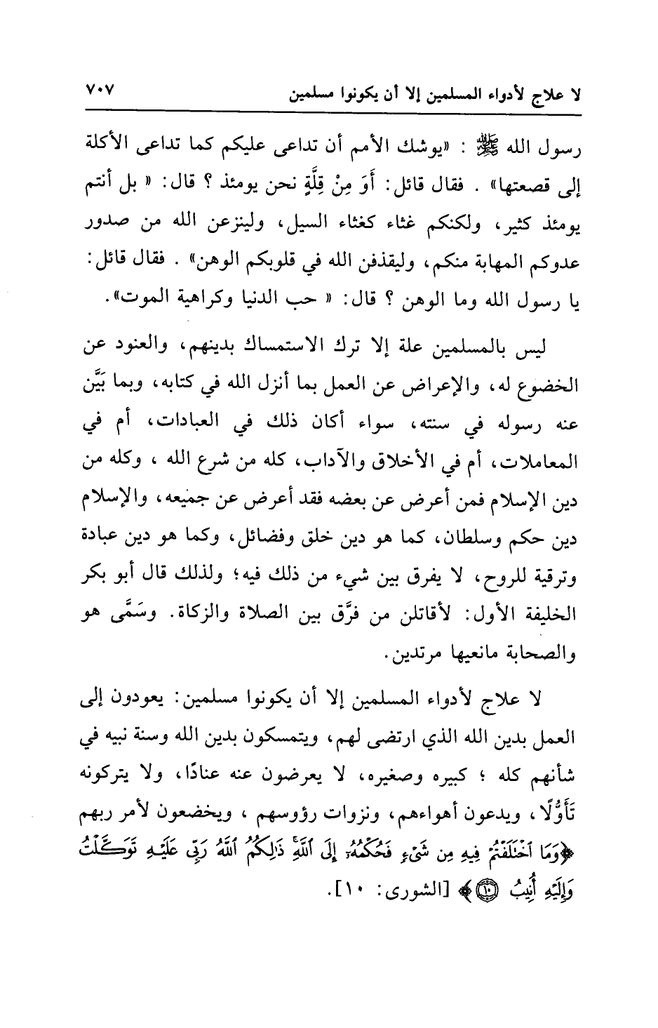 لا علاج لأدواء المسلمين إلا أن يكونوا مسلمين: يعودون إلى العمل بدين الله الذي ارتضى لهم، ويتمسكون بدين الله وسنة نبيه في شأنهم كله؛ كبيره وصغيره، لا يعرضون عنه عنادًا، ولا يتركونه تَأَوُّلًا، ويدعون أهواءهم، ونزوات رؤوسهم، ويخضعون لأمر ربهم {وَمَا اخْتَلَفْتُمْ فِيهِ مِنْ شَيْءٍ فَحُكْمُهُ إِلَى اللَّهِ ذَلِكُمُ اللَّهُ رَبِّي عَلَيْهِ تَوَكَّلْتُ وَإِلَيْهِ أُنِيبُ (10)} [الشورى: 10].