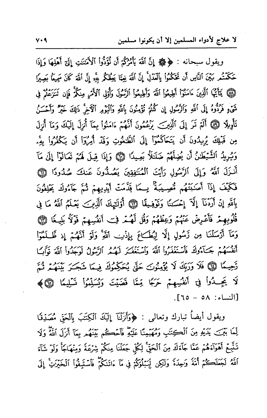 ويقول سبحانه: {إِنَّ اللَّهَ يَأْمُرُكُمْ أَنْ تُؤَدُّوا الْأَمَانَاتِ إِلَى أَهْلِهَا وَإِذَا حَكَمْتُمْ بَيْنَ النَّاسِ أَنْ تَحْكُمُوا بِالْعَدْلِ إِنَّ اللَّهَ نِعِمَّا يَعِظُكُمْ بِهِ إِنَّ اللَّهَ كَانَ سَمِيعًا بَصِيرًا (58) يَاأَيُّهَا الَّذِينَ آمَنُوا أَطِيعُوا اللَّهَ وَأَطِيعُوا الرَّسُولَ وَأُولِي الْأَمْرِ مِنْكُمْ فَإِنْ تَنَازَعْتُمْ فِي شَيْءٍ فَرُدُّوهُ إِلَى اللَّهِ وَالرَّسُولِ إِنْ كُنْتُمْ تُؤْمِنُونَ بِاللَّهِ وَالْيَوْمِ الْآخِرِ ذَلِكَ خَيْرٌ وَأَحْسَنُ تَأْوِيلًا (59) أَلَمْ تَرَ إِلَى الَّذِينَ يَزْعُمُونَ أَنَّهُمْ آمَنُوا بِمَا أُنْزِلَ إِلَيْكَ وَمَا أُنْزِلَ مِنْ قَبْلِكَ يُرِيدُونَ أَنْ يَتَحَاكَمُوا إِلَى الطَّاغُوتِ وَقَدْ أُمِرُوا أَنْ يَكْفُرُوا بِهِ وَيُرِيدُ الشَّيْطَانُ أَنْ يُضِلَّهُمْ ضَلَالًا بَعِيدًا (60) وَإِذَا قِيلَ لَهُمْ تَعَالَوْا إِلَى مَا أَنْزَلَ اللَّهُ وَإِلَى الرَّسُولِ رَأَيْتَ الْمُنَافِقِينَ يَصُدُّونَ عَنْكَ صُدُودًا (61) فَكَيْفَ إِذَا أَصَابَتْهُمْ مُصِيبَةٌ بِمَا قَدَّمَتْ أَيْدِيهِمْ ثُمَّ جَاءُوكَ يَحْلِفُونَ بِاللَّهِ إِنْ أَرَدْنَا إِلَّا إِحْسَانًا وَتَوْفِيقًا (62) أُولَئِكَ الَّذِينَ يَعْلَمُ اللَّهُ مَا فِي قُلُوبِهِمْ فَأَعْرِضْ عَنْهُمْ وَعِظْهُمْ وَقُلْ لَهُمْ فِي أَنْفُسِهِمْ قَوْلًا بَلِيغًا (63) وَمَا أَرْسَلْنَا مِنْ رَسُولٍ إِلَّا لِيُطَاعَ بِإِذْنِ اللَّهِ وَلَوْ أَنَّهُمْ إِذْ ظَلَمُوا أَنْفُسَهُمْ جَاءُوكَ فَاسْتَغْفَرُوا اللَّهَ وَاسْتَغْفَرَ لَهُمُ الرَّسُولُ لَوَجَدُوا اللَّهَ تَوَّابًا رَحِيمًا (64) فَلَا وَرَبِّكَ لَا يُؤْمِنُونَ حَتَّى يُحَكِّمُوكَ فِيمَا شَجَرَ بَيْنَهُمْ ثُمَّ لَا يَجِدُوا فِي أَنْفُسِهِمْ حَرَجًا مِمَّا قَضَيْتَ وَيُسَلِّمُوا تَسْلِيمًا (65)} [النساء: 58 - 65].
