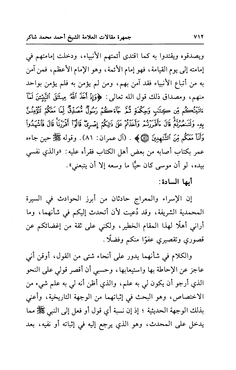 إن الإسراء والمعراج حادثان من أبرز الحوادث في السيرة المحمدية الشريفة، وقد دُعيت لأن أتحدث إليكم في شأنهما، وما أراني أهلًا لهذا المقام الخطير، ولكني على ثقة من إغضائكم عن قصوري وتقصيري عفوًا منكم وفضلًا.