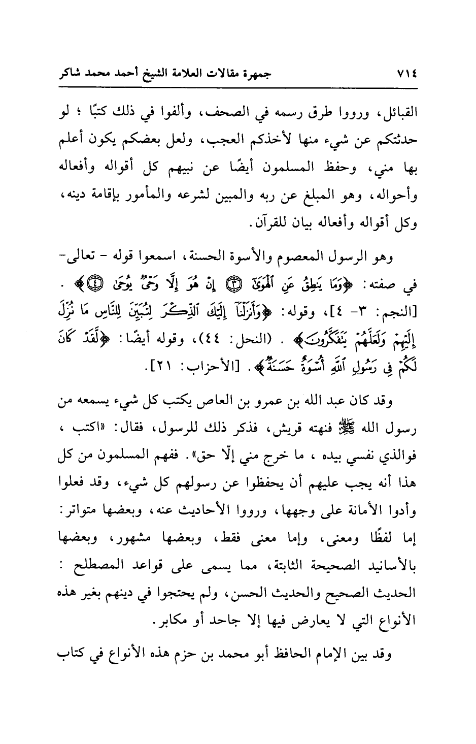 وقد كان عبد الله بن عمرو بن العاص يكتب كل شيء يسمعه من رسول الله - صلى الله عليه وسلم - فنهته قريش، فذكر ذلك للرسول، فقال: "اكتب، فوالذي نفسي بيده، ما خرج مني إلّا حق". ففهم المسلمون من كل هذا أنه يجب عليهم أن يحفظوا عن رسولهم كل شيء، وقد فعلوا وأدوا الأمانة على وجهها، ورووا الأحاديث عنه، وبعضها متواتر: إما لفظًا ومعنى، وإما معنى فقط، وبعضها مشهور، وبعضها بالأسانيد الصحيحة الثابتة، مما يسمى على قواعد المصطلح: الحديث الصحيح والحديث الحسن، ولم يحتجوا في دينهم بغير هذه الأنواع التي لا يعارض فيها إلا جاحد أو مكابر.