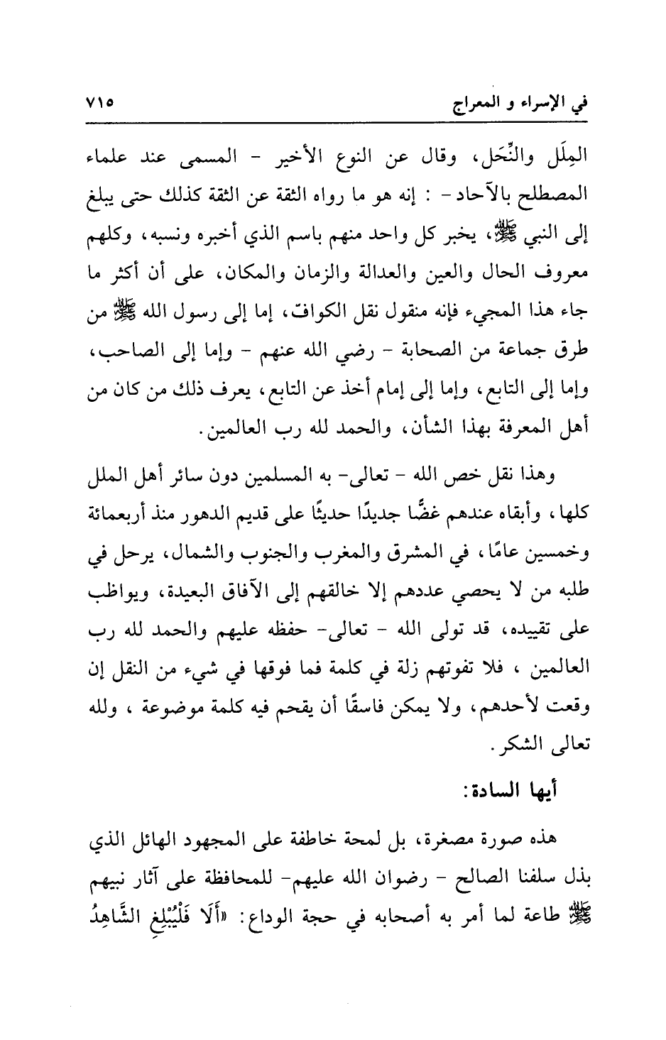 المِلَل والنِّحَل، وقال عن النوع الأخير - المسمى عند علماء المصطلح بالآحاد -: إنه هو ما رواه الثقة عن الثقة كذلك حتى يبلغ إلى النبي - صلى الله عليه وسلم -، يخبر كل واحد منهم باسم الذي أخبره ونسبه، وكلهم معروف الحال والعين والعدالة والزمان والمكان، على أن أكثر ما جاء هذا المجيء فإنه منقول نقل الكوافّ، إما إلى رسول الله - صلى الله عليه وسلم - من طرق جماعة من الصحابة - رضي الله عنهم - وإما إلى الصاحب، وإما إلى التابع، وإما إلى إمام أخذ عن التابع، يعرف ذلك من كان من أهل المعرفة بهذا الشأن، والحمد لله رب العالمين.