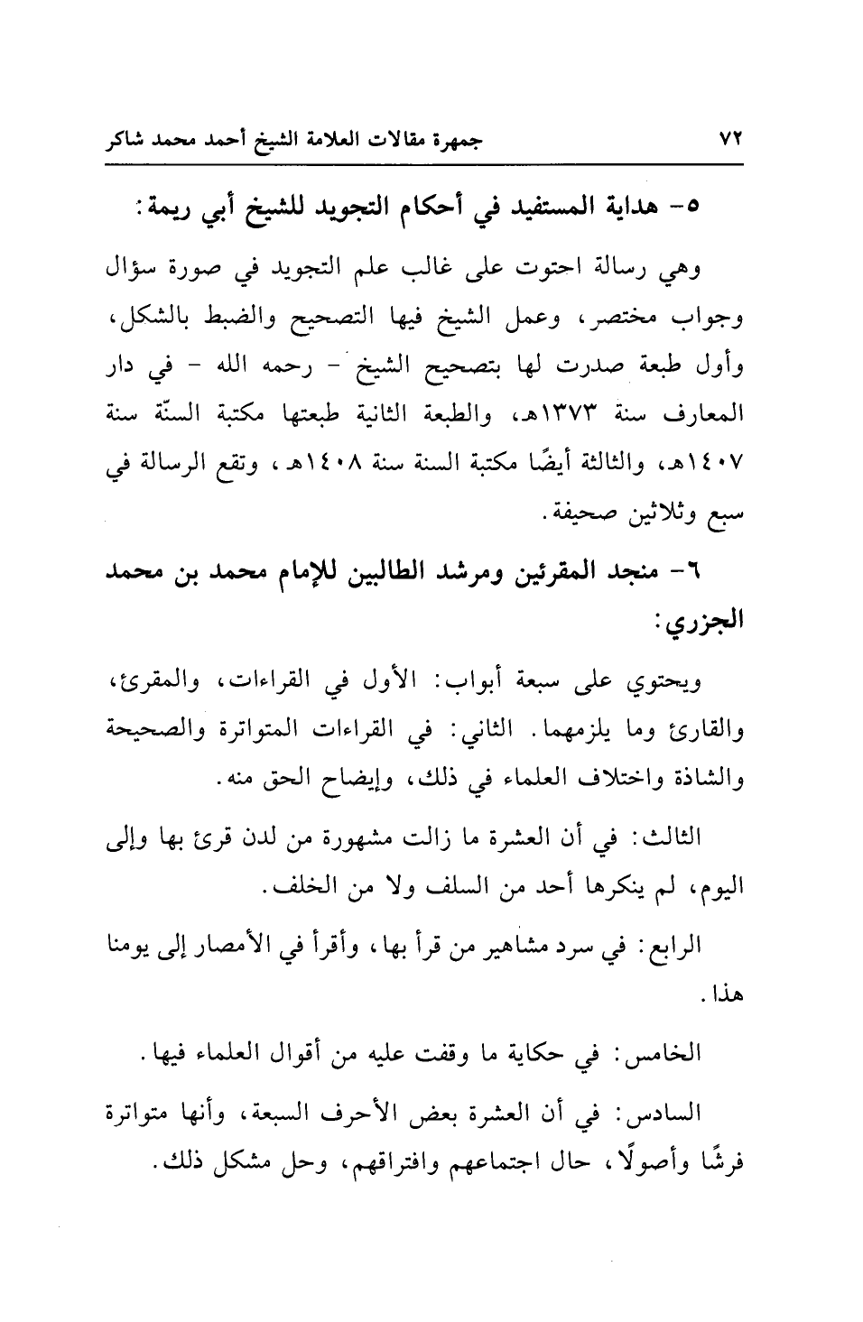 وهي رسالة احتوت على غالب علم التجويد في صورة سؤال وجواب مختصر، وعمل الشيخ فيها التصحيح والضبط بالشكل، وأول طبعة صدرت لها بتصحيح الشيخ - رحمه الله - في دار المعارف سنة 1373 هـ، والطبعة الثانية طبعتها مكتبة السنّة سنة 1407 هـ، والثالثة أيضًا مكتبة السنة سنة 1408 هـ، وتقع الرسالة في سبع وثلاثين صحيفة.