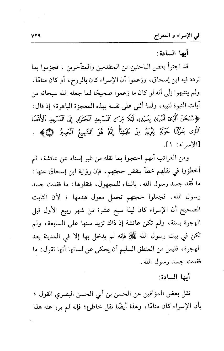 ومن الغرائب أنهم احتجوا بما نقله من غير إسناد عن عائشة، ثم أخطؤوا في نقلهم خطأ ينقض حجتهم، فإن رواية ابن إسحاق عنها: ما فُقد جسد رسول الله. بالبناء للمجهول، فنقلوها: ما فقدت جسد رسول الله. فجعلوا حجتهم تحمل معول هدمها؛ لأن الثابت الصحيح أن الإسراء كان ليلة سبع عشرة من شهر ربيع الأول قبل الهجرة بسنة، ولم تكن عائشة إذ ذاك تزيد سنها على السابعة، ولم تكن في بيت رسول الله - صلى الله عليه وسلم - فإنه لم يدخل بها إلا في المدينة بعد الهجرة، فليس من المنطق السليم أن يحكى عن لسانها أنها تقول: ما فقدت جسد رسول الله.