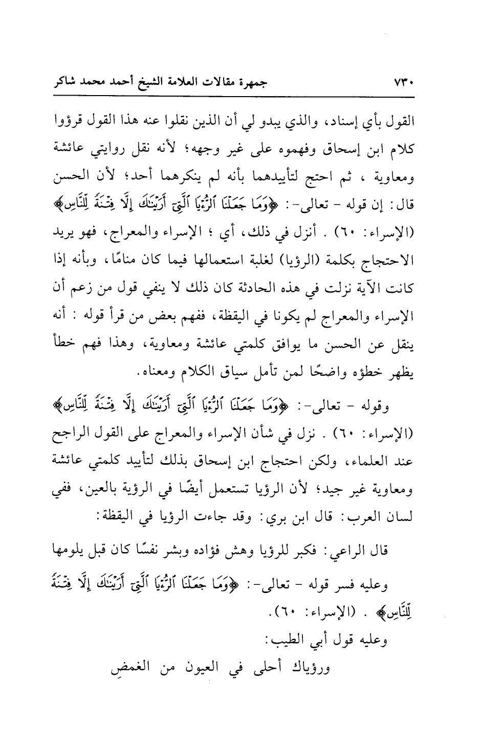 وقوله - تعالى -: {وَمَا جَعَلْنَا الرُّؤْيَا الَّتِي أَرَيْنَاكَ إِلَّا فِتْنَةً لِلنَّاسِ} [الإسراء: 60]. نزل في شأن الإسراء والمعراج على القول الراجح عند العلماء، ولكن احتجاج ابن إسحاق بذلك لتأييد كلمتي عائشة ومعاوية غير جيد؛ لأن الرؤيا تستعمل أيضًا في الرؤية بالعين، ففي لسان العرب: قال ابن بري: وقد جاءت الرؤيا في اليقظة: