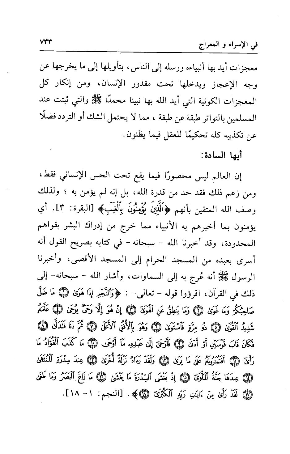 إن العالم ليس محصورًا فيما يقع تحت الحس الإنساني فقط، ومن زعم ذلك فقد حد من قدرة الله، بل إنه لم يؤمن به؛ ولذلك وصف الله المتقين بأنهم {الَّذِينَ يُؤْمِنُونَ بِالْغَيْبِ} [البقرة: 3]. أي يؤمنون بما أخبرهم به الأنبياء مما خرج من إدراك البشر بقواهم المحدودة، وقد أخبرنا الله - سبحانه - في كتابه بصريح القول أنه أسرى بعبده من المسجد الحرام إلى المسجد الأقصى، وأخبرنا الرسول - صلى الله عليه وسلم - أنه عُرج به إلى السماوات، وأشار الله - سبحانه - إلى ذلك في القرآن، اقرؤوا قوله - تعالى -: {وَالنَّجْمِ إِذَا هَوَى (1) مَا ضَلَّ صَاحِبُكُمْ وَمَا غَوَى (2) وَمَا يَنْطِقُ عَنِ الْهَوَى (3) إِنْ هُوَ إِلَّا وَحْيٌ يُوحَى (4) عَلَّمَهُ شَدِيدُ الْقُوَى (5) ذُو مِرَّةٍ فَاسْتَوَى (6) وَهُوَ بِالْأُفُقِ الْأَعْلَى (7) ثُمَّ دَنَا فَتَدَلَّى (8) فَكَانَ قَابَ قَوْسَيْنِ أَوْ أَدْنَى (9) فَأَوْحَى إِلَى عَبْدِهِ مَا أَوْحَى (10) مَا كَذَبَ الْفُؤَادُ مَا رَأَى (11) أَفَتُمَارُونَهُ عَلَى مَا يَرَى (12) وَلَقَدْ رَآهُ نَزْلَةً أُخْرَى (13) عِنْدَ سِدْرَةِ الْمُنْتَهَى (14) عِنْدَهَا جَنَّةُ الْمَأْوَى (15) إِذْ يَغْشَى السِّدْرَةَ مَا يَغْشَى (16) مَا زَاغَ الْبَصَرُ وَمَا طَغَى (17) لَقَدْ رَأَى مِنْ آيَاتِ رَبِّهِ الْكُبْرَى (18)} [النجم: 1 - 18].