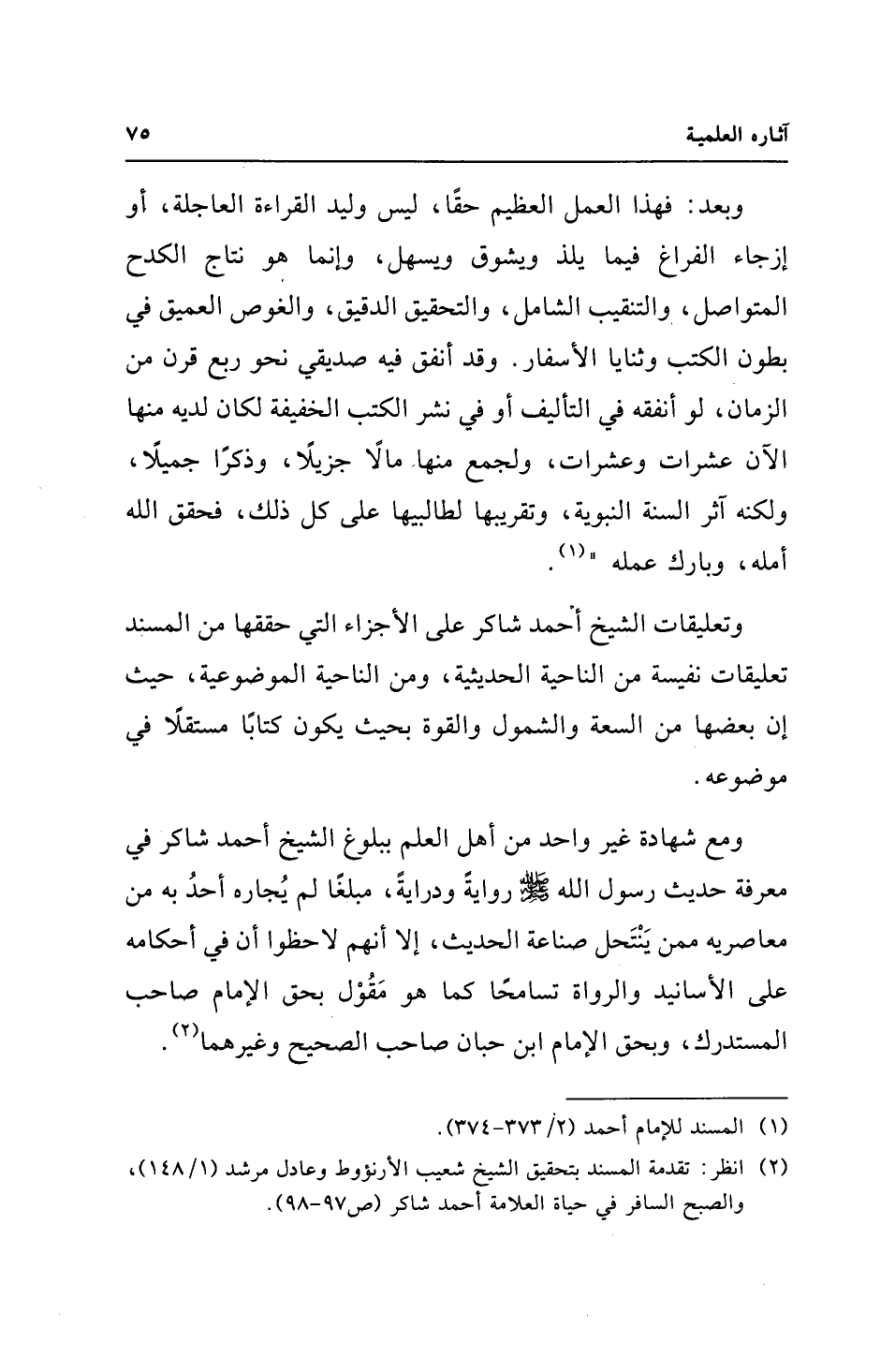 (¬2) انظر: تقدمة المسند بتحقيق الشيخ شعيب الأرنؤوط وعادل مرشد (1/ 148)، والصبح السافر في حياة العلامة أحمد شاكر (ص 97 - 98).