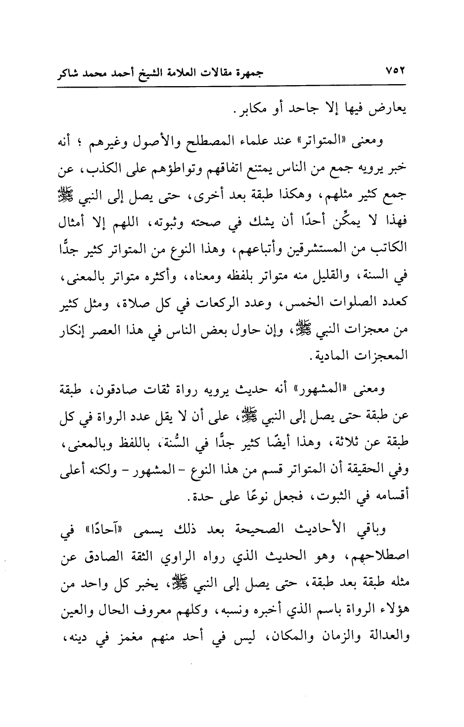 ومعنى "المتواتر" عند علماء المصطلح والأصول وغيرهم؛ أنه خبر يرويه جمع من الناس يمتنع اتفاقهم وتواطؤهم على الكذب، عن جمع كثير مثلهم، وهكذا طبقة بعد أخرى، حتى يصل إلى النبي - صلى الله عليه وسلم - فهذا لا يمكِّن أحدًا أن يشك في صحته وثبوته، اللهم إلا أمثال الكاتب من المستشرقين وأتباعهم، وهذا النوع من المتواتر كثير جدًّا في السنة، والقليل منه متواتر بلفظه ومعناه، وأكثره متواتر بالمعنى، كعدد الصلوات الخمس، وعدد الركعات في كل صلاة، ومثل كثير من معجزات النبي - صلى الله عليه وسلم -، وإن حاول بعض الناس في هذا العصر إنكار المعجزات المادية.
