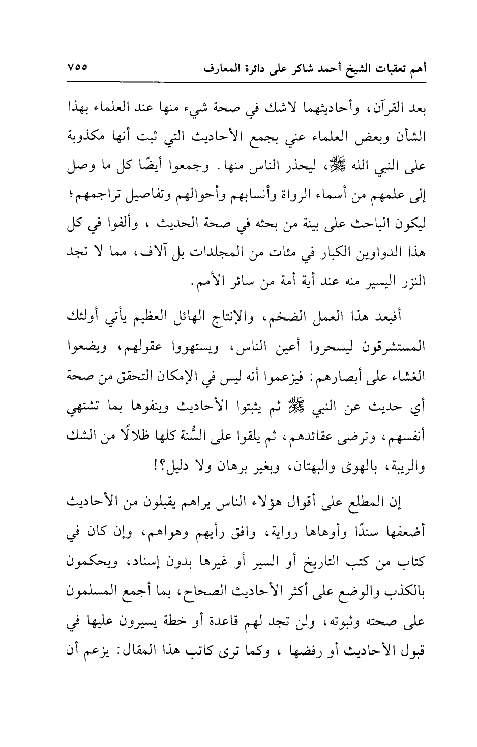أفبعد هذا العمل الضخم، والإنتاج الهائل العظيم يأتي أولئك المستشرقون ليسحروا أعين الناس، ويستهووا عقولهم، ويضعوا الغشاء على أبصارهم: فيزعموا أنه ليس في الإمكان التحقق من صحة أي حديث عن النبي - صلى الله عليه وسلم - ثم يثبتوا الأحاديث وينفوها بما تشتهي أنفسهم، وترضى عقائدهم، ثم يلقوا على السُّنة كلها ظلالًا من الشك والريبة، بالهوى والبهتان، وبغير برهان ولا دليل؟ !