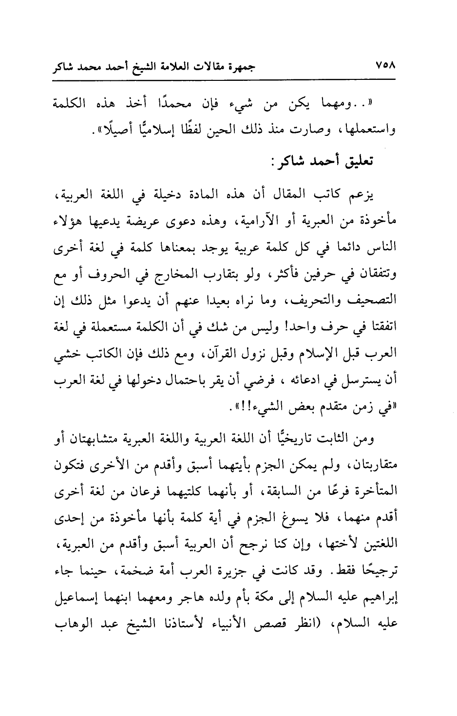 ومن الثابت تاريخيًّا أن اللغة العربية واللغة العبرية متشابهتان أو متقاربتان، ولم يمكن الجزم بأيتهما أسبق وأقدم من الأخرى فتكون المتأخرة فرعًا من السابقة، أو بأنهما كلتيهما فرعان من لغة أخرى أقدم منهما، فلا يسوغ الجزم في أية كلمة بأنها مأخوذة من إحدى اللغتين لأختها، وإن كنا نرجح أن العربية أسبق وأقدم من العبرية، ترجيحًا فقط. وقد كانت في جزيرة العرب أمة ضخمة، حينما جاء إبراهيم عليه السلام إلى مكة بأم ولده هاجر ومعهما ابنهما إسماعيل عليه السلام، (انظر قصص الأنبياء لأستاذنا الشيخ عبد الوهاب