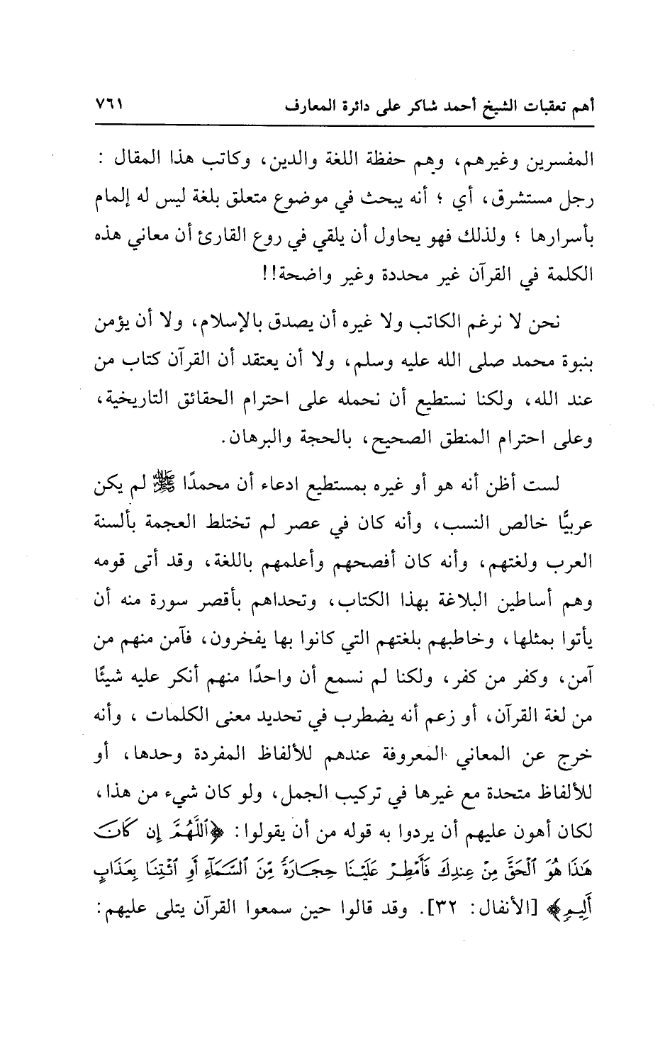 لست أظن أنه هو أو غيره بمستطيع ادعاء أن محمدًا - صلى الله عليه وسلم - لم يكن عربيًّا خالص النسب، وأنه كان في عصر لم تختلط العجمة بألسنة العرب ولغتهم، وأنه كان أفصحهم وأعلمهم باللغة، وقد أتى قومه وهم أساطين البلاغة بهذا الكتاب، وتحداهم بأقصر سورة منه أن يأتوا بمثلها، وخاطبهم بلغتهم التي كانوا بها يفخرون، فآمن منهم من آمن، وكفر من كفر، ولكنا لم نسمع أن واحدًا منهم أنكر عليه شيئًا من لغة القرآن، أو زعم أنه يضطرب في تحديد معنى الكلمات، وأنه خرج عن المعاني المعروفة عندهم للألفاظ المفردة وحدها، أو للألفاظ متحدة مع غيرها في تركيب الجمل، ولو كان شيء من هذا، لكان أهون عليهم أن يردوا به قوله من أن يقولوا: {اللَّهُمَّ إِنْ كَانَ هَذَا هُوَ الْحَقَّ مِنْ عِنْدِكَ فَأَمْطِرْ عَلَيْنَا حِجَارَةً مِنَ السَّمَاءِ أَوِ ائْتِنَا بِعَذَابٍ أَلِيمٍ} [الأنفال: 32]. وقد قالوا حين سمعوا القرآن يتلى عليهم: