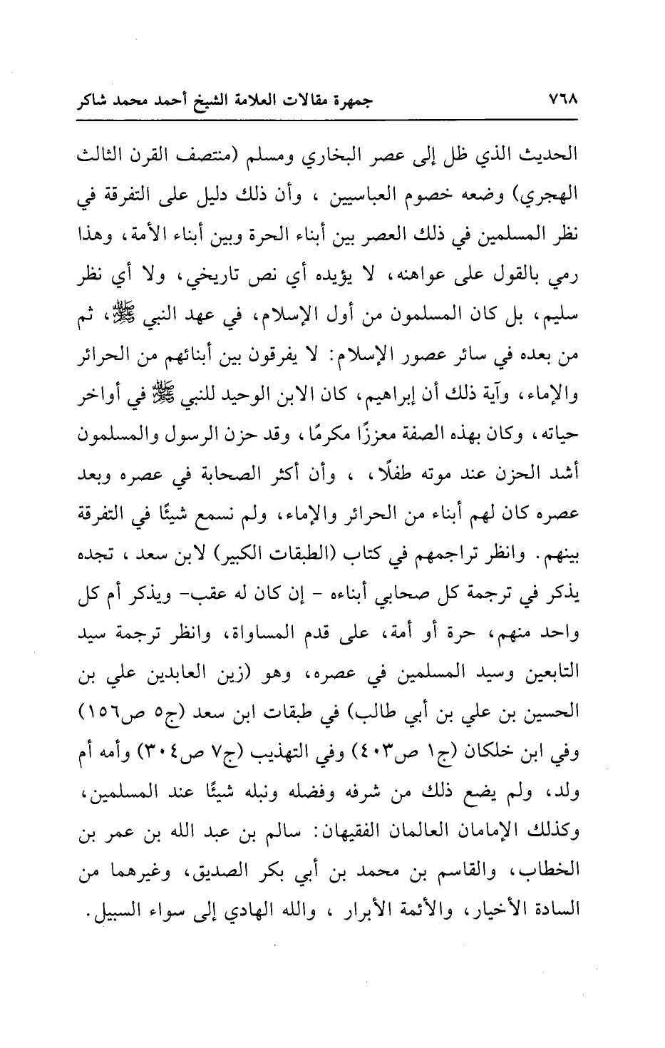 الحديث الذي ظل إلى عصر البخاري ومسلم (منتصف القرن الثالث الهجري) وضعه خصوم العباسيين، وأن ذلك دليل على التفرقة في نظر المسلمين في ذلك العصر بين أبناء الحرة وبين أبناء الأمة، وهذا رمي بالقول على عواهنه، لا يؤيده أي نص تاريخي، ولا أي نظر سليم، بل كان المسلمون من أول الإسلام، في عهد النبي - صلى الله عليه وسلم -، ثم من بعده في سائر عصور الإسلام: لا يفرقون بين أبنائهم من الحرائر والإماء، وآية ذلك أن إبراهيم، كان الابن الوحيد للنبي - صلى الله عليه وسلم - في أواخر حياته، وكان بهذه الصفة معززًا مكرمًا، وقد حزن الرسول والمسلمون أشد الحزن عند موته طفلًا، وأن أكثر الصحابة في عصره وبعد عصره كان لهم أبناء من الحرائر والإماء، ولم نسمع شيئًا في التفرقة بينهم. وانظر تراجمهم في كتاب (الطبقات الكبير) لابن سعد، تجده يذكر في ترجمة كل صحابي أبناءه - إن كان له عقب - ويذكر أم كل واحد منهم، حرة أو أمة، على قدم المساواة، وانظر ترجمة سيد التابعين وسيد المسلمين في عصره، وهو (زين العابدين علي بن الحسين بن علي بن أبي طالب) في طبقات ابن سعد (ج 5 ص 156) وفي ابن خلكان (ج 1 ص 403) وفي التهذيب (ج 7 ص 304) وأمه أم ولد، ولم يضع ذلك من شرفه وفضله ونبله شيئًا عند المسلمين، وكذلك الإمامان العالمان الفقيهان: سالم بن عبد الله بن عمر بن الخطاب، والقاسم بن محمد بن أبي بكر الصديق، وغيرهما من السادة الأخيار، والأئمة الأبرار، والله الهادي إلى سواء السبيل.