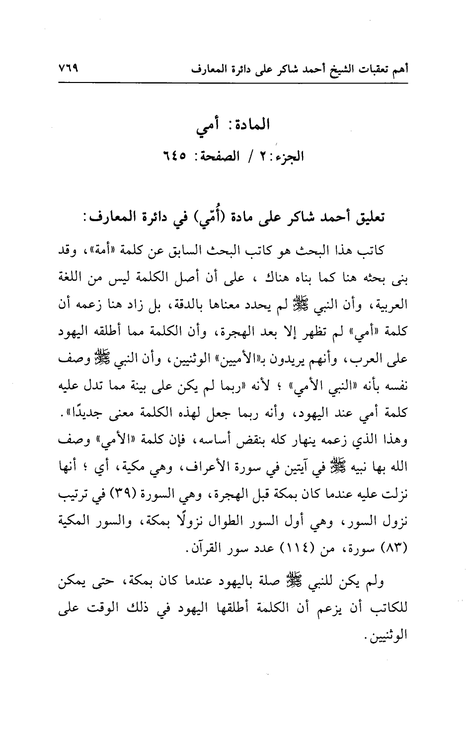 تعليق أحمد شاكر على مادة (أُمّي) في دائرة المعارف: