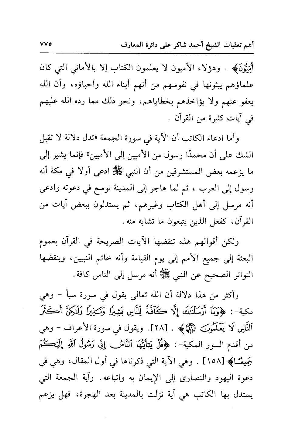 وأكثر من هذا دلالة أن الله تعالى يقول في سورة سبأ - وهي مكية -: {وَمَا أَرْسَلْنَاكَ إِلَّا كَافَّةً لِلنَّاسِ بَشِيرًا وَنَذِيرًا وَلَكِنَّ أَكْثَرَ النَّاسِ لَا يَعْلَمُونَ (28)}. [28]. ويقول في سورة الأعراف - وهي من أقدم السور المكية -: {قُلْ يَاأَيُّهَا النَّاسُ إِنِّي رَسُولُ اللَّهِ إِلَيْكُمْ جَمِيعًا} [158]. وهي الآية التي ذكرناها في أول المقال، وهي في دعوة اليهود والنصارى إلى الإِيمان به واتباعه. وآية الجمعة التي يستدل بها الكاتب هي آية نزلت بالمدينة بعد الهجرة، فهل يزعم