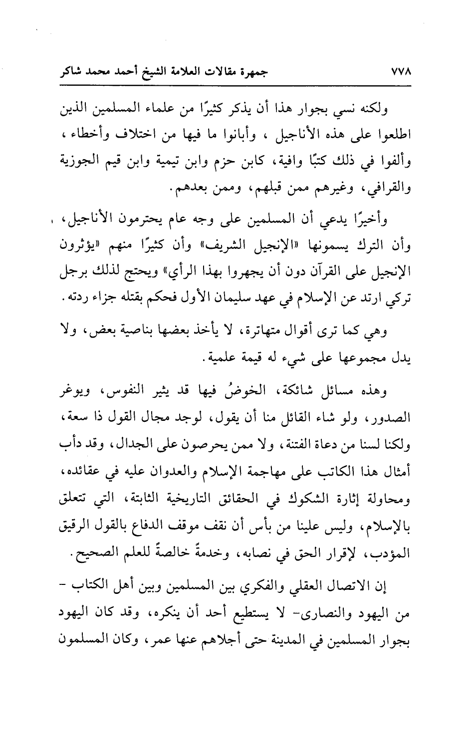 ولكنه نسي بجوار هذا أن يذكر كثيرًا من علماء المسلمين الذين اطلعوا على هذه الأناجيل، وأبانوا ما فيها من اختلاف وأخطاء، وألفوا في ذلك كتبًا وافية، كابن حزم وابن تيمية وابن قيم الجوزية والقرافي، وغيرهم ممن قبلهم، وممن بعدهم.