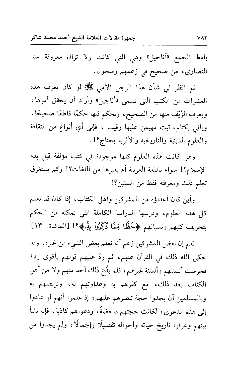 ثم انظر في شأن هذا الرجل الأمي - صلى الله عليه وسلم - لو كان يعرف هذه العشرات من الكتب التي تسمى "أناجيل" وأراد أن يحقق أمرها، ويعرف الزَّيْف منها من الصحيح، ويحكم فيها حكمًا قاطعًا صحيحًا، ويأتي بكتاب ثبت مهيمن عليها رقيب، فإلى أي أنواع من الثقافة والعلوم الدينية والتاريخية والأثرية يحتاج؟ ! .