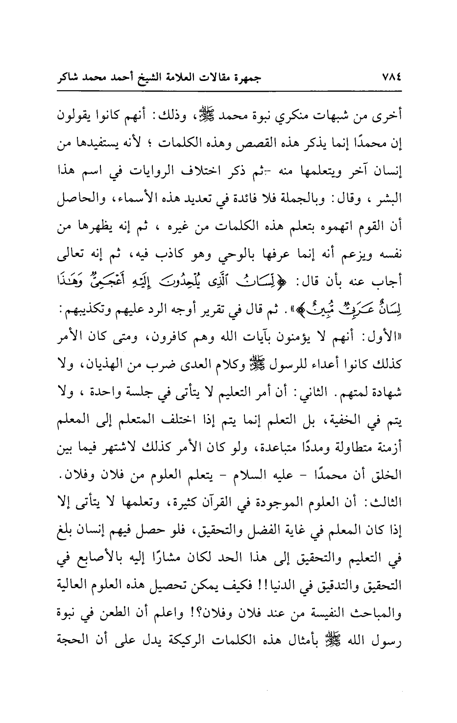 أخرى من شبهات منكري نبوة محمد - صلى الله عليه وسلم -، وذلك: أنهم كانوا يقولون إن محمدًا إنما يذكر هذه القصص وهذه الكلمات؛ لأنه يستفيدها من إنسان آخر ويتعلمها منه - ثم ذكر اختلاف الروايات في اسم هذا البشر، وقال: وبالجملة فلا فائدة في تعديد هذه الأسماء، والحاصل أن القوم اتهموه بتعلم هذه الكلمات من غيره، ثم إنه يظهرها من نفسه ويزعم أنه إنما عرفها بالوحي وهو كاذب فيه، ثم إنه تعالى أجاب عنه بأن قال: {لِسَانُ الَّذِي يُلْحِدُونَ إِلَيْهِ أَعْجَمِيٌّ وَهَذَا لِسَانٌ عَرَبِيٌّ مُبِينٌ} ". ثم قال في تقرير أوجه الرد عليهم وتكذيبهم: "الأول: أنهم لا يؤمنون بآيات الله وهم كافرون، ومتى كان الأمر كذلك كانوا أعداء للرسول - صلى الله عليه وسلم - وكلام العدى ضرب من الهذيان، ولا شهادة لمتهم. الثاني: أن أمر التعليم لا يتأتى في جلسة واحدة، ولا يتم في الخفية، بل التعلم إنما يتم إذا اختلف المتعلم إلى المعلم أزمنة متطاولة ومددًا متباعدة، ولو كان الأمر كذلك لاشتهر فيما بين الخلق أن محمدًا - عليه السلام - يتعلم العلوم من فلان وفلان. الثالث: أن العلوم الموجودة في القرآن كثيرة، وتعلمها لا يتأتى إلا إذا كان المعلم في غاية الفضل والتحقيق، فلو حصل فيهم إنسان بلغ في التعليم والتحقيق إلى هذا الحد لكان مشارًا إليه بالأصابع في التحقيق والتدقيق في الدنيا! ! فكيف يمكن تحصيل هذه العلوم العالية والمباحث النفيسة من عند فلان وفلان؟ ! واعلم أن الطعن في نبوة رسول الله - صلى الله عليه وسلم - بأمثال هذه الكلمات الركيكة يدل على أن الحجة