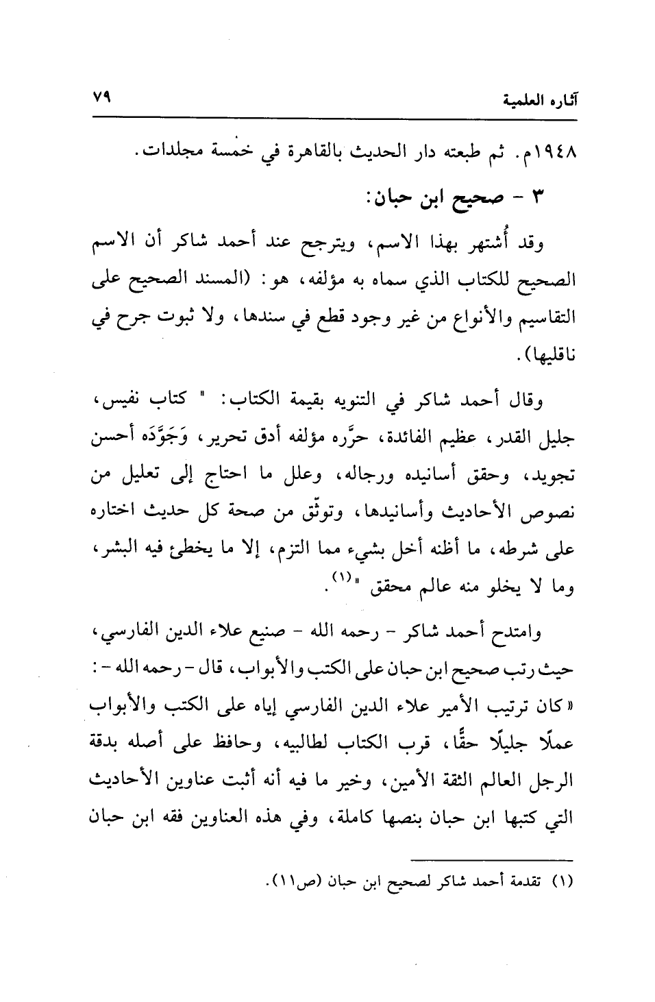 (¬1) تقدمة أحمد شاكر لصحيح ابن حبان (ص 11).