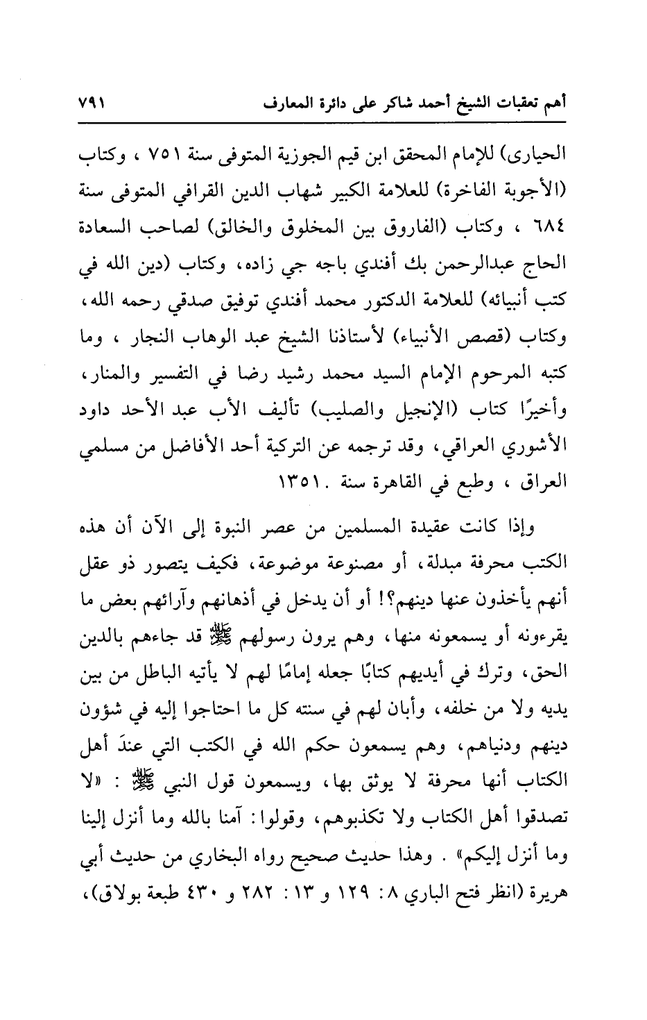 وإذا كانت عقيدة المسلمين من عصر النبوة إلى الآن أن هذه الكتب محرفة مبدلة، أو مصنوعة موضوعة، فكيف يتصور ذو عقل أنهم يأخذون عنها دينهم؟ ! أو أن يدخل في أذهانهم وآرائهم بعض ما يقرءونه أو يسمعونه منها، وهم يرون رسولهم - صلى الله عليه وسلم - قد جاءهم بالدين الحق، وترك في أيديهم كتابًا جعله إمامًا لهم لا يأتيه الباطل من بين يديه ولا من خلفه، وأبان لهم في سنته كل ما احتاجوا إليه في شؤون دينهم ودنياهم، وهم يسمعون حكم الله في الكتب التي عندَ أهل الكتاب أنها محرفة لا يوثق بها، ويسمعون قول النبي - صلى الله عليه وسلم -: "لا تصدقوا أهل الكتاب ولا تكذبوهم، وقولوا: آمنا بالله وما أنزل إلينا وما أنزل إليكم". وهذا حديث صحيح رواه البخاري من حديث أبي هريرة (انظر فتح الباري 8: 129 و 13: 282 و 430 طبعة بولاق)،
