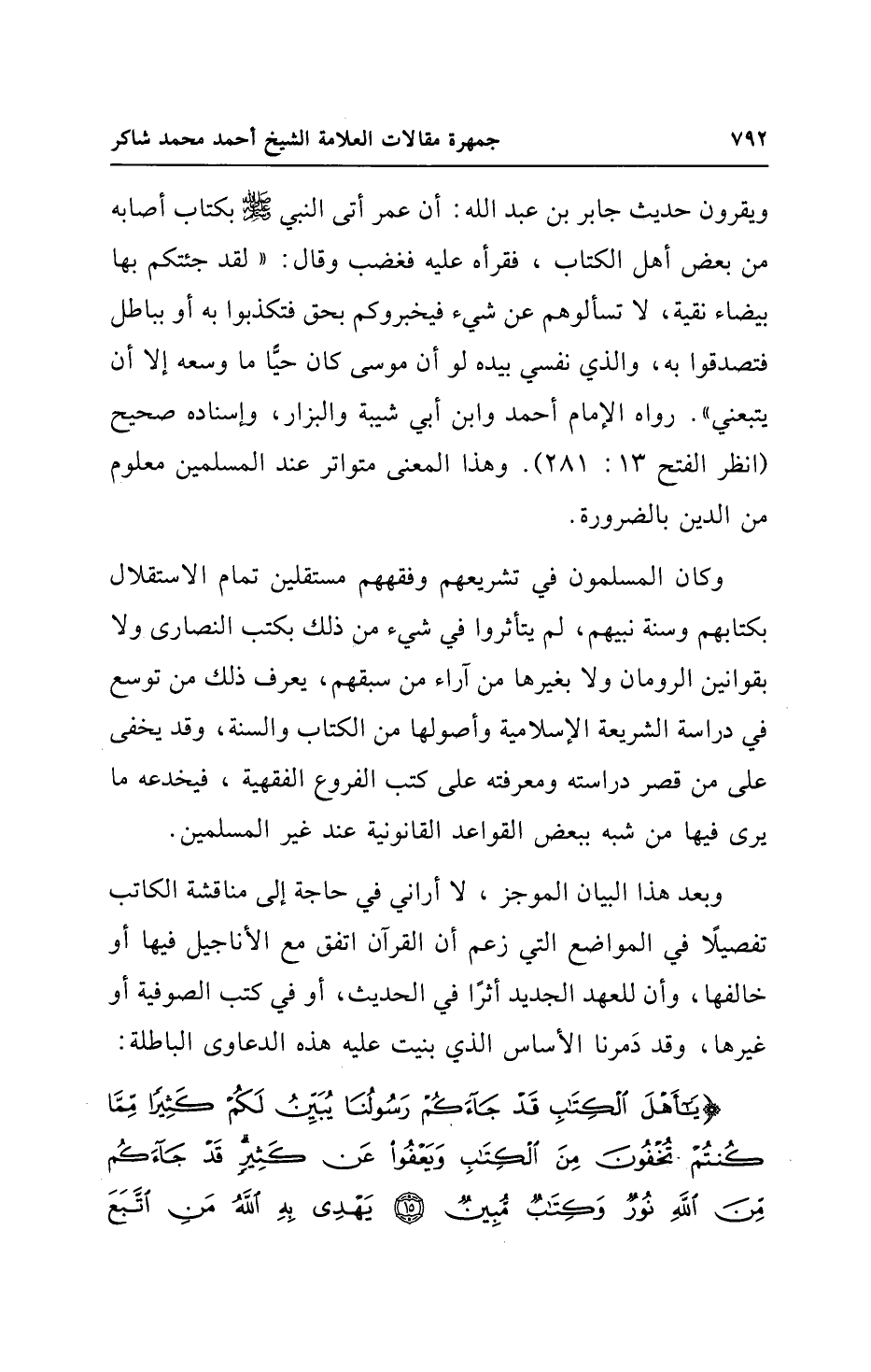 ويقرون حديث جابر بن عبد الله: أن عمر أتى النبي - صلى الله عليه وسلم - بكتاب أصابه من بعض أهل الكتاب، فقرأه عليه فغضب وقال: "لقد جئتكم بها بيضاء نقية، لا تسألوهم عن شيء فيخبروكم بحق فتكذبوا به أو بباطل فتصدقوا به، والذي نفسي بيده لو أن موسى كان حيًّا ما وسعه إلا أن يتبعني". رواه الإمام أحمد وابن أبي شيبة والبزار، وإسناده صحيح (انظر الفتح 13: 281). وهذا المعنى متواتر عند المسلمين معلوم من الدين بالضرورة.