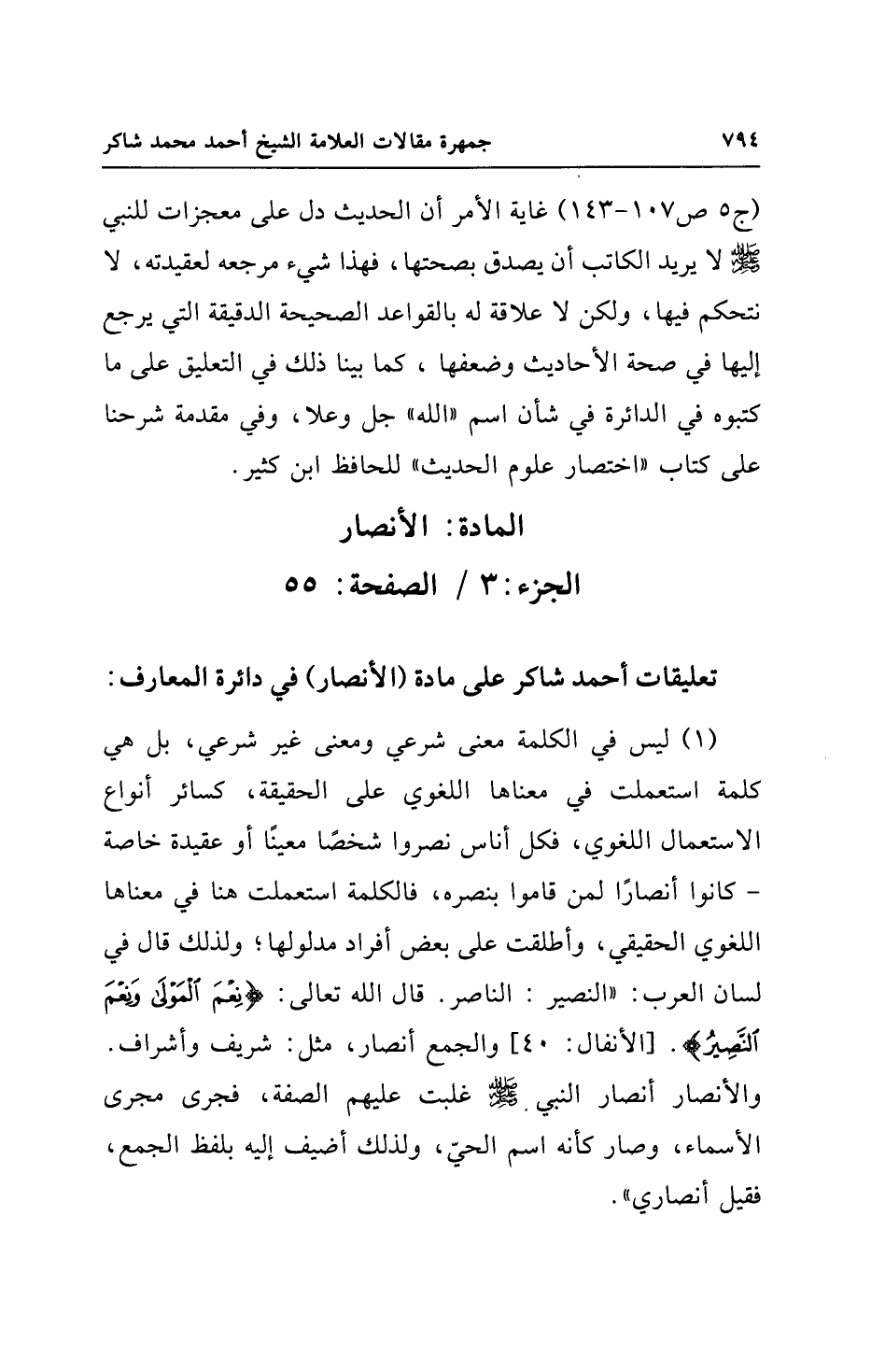 تعليقات أحمد شاكر على مادة (الأنصار) في دائرة المعارف: