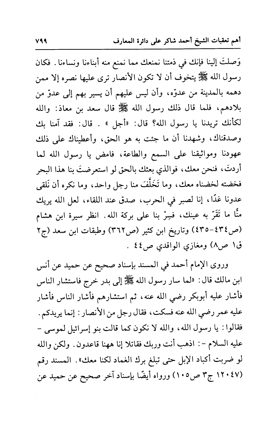 وروى الإمام أحمد في المسند بإسناد صحيح عن حميد عن أنس ابن مالك قال: "لما سار رسول الله - صلى الله عليه وسلم - إلى بدر خرج فاستشار الناس فأشار عليه أبو بكر رضي الله عنه، ثم استشارهم فأشار الناس فأشار عليه عمر رضي الله عنه فسكت، فقال رجل من الأنصار: إنما يريدكم. فقالوا: يا رسول الله، والله لا نكون كما قالت بنو إسرائيل لموسى - عليه السلام -: اذهب أنت وربك فقاتلا إنا ههنا قاعدون. ولكن والله لو ضربت أكباد الإبل حتى تبلغ برك الغماد لكنا معك". المسند رقم (12047 ج 3 ص 105) ورواه أيضًا بإسناد آخر صحيح عن حميد عن